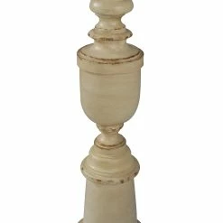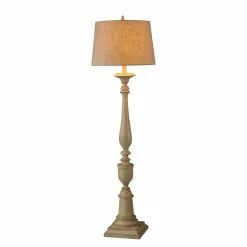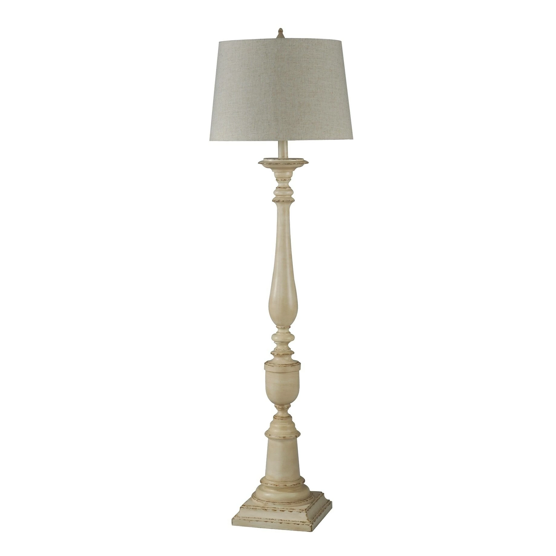 This floor lamp comes in a distressed off white finish with an oatmeal shade; Requires one (1) 150-watt Incandescent E26 base bulb (not included).
