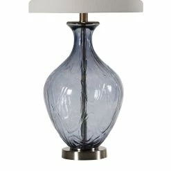 Enjoy beautiful durability and modern fashion with the Adrienne table lamp. The body is made of glass with a sheer blue finish while the base consists of steel. Its contemporary styling is rounded out with a classic round, hardback shade, so you can be confident it will look gorgeous in your bedroom. A handpainted finish means each piece is unique, with possible slight variations. No two lamps are exactly alike.