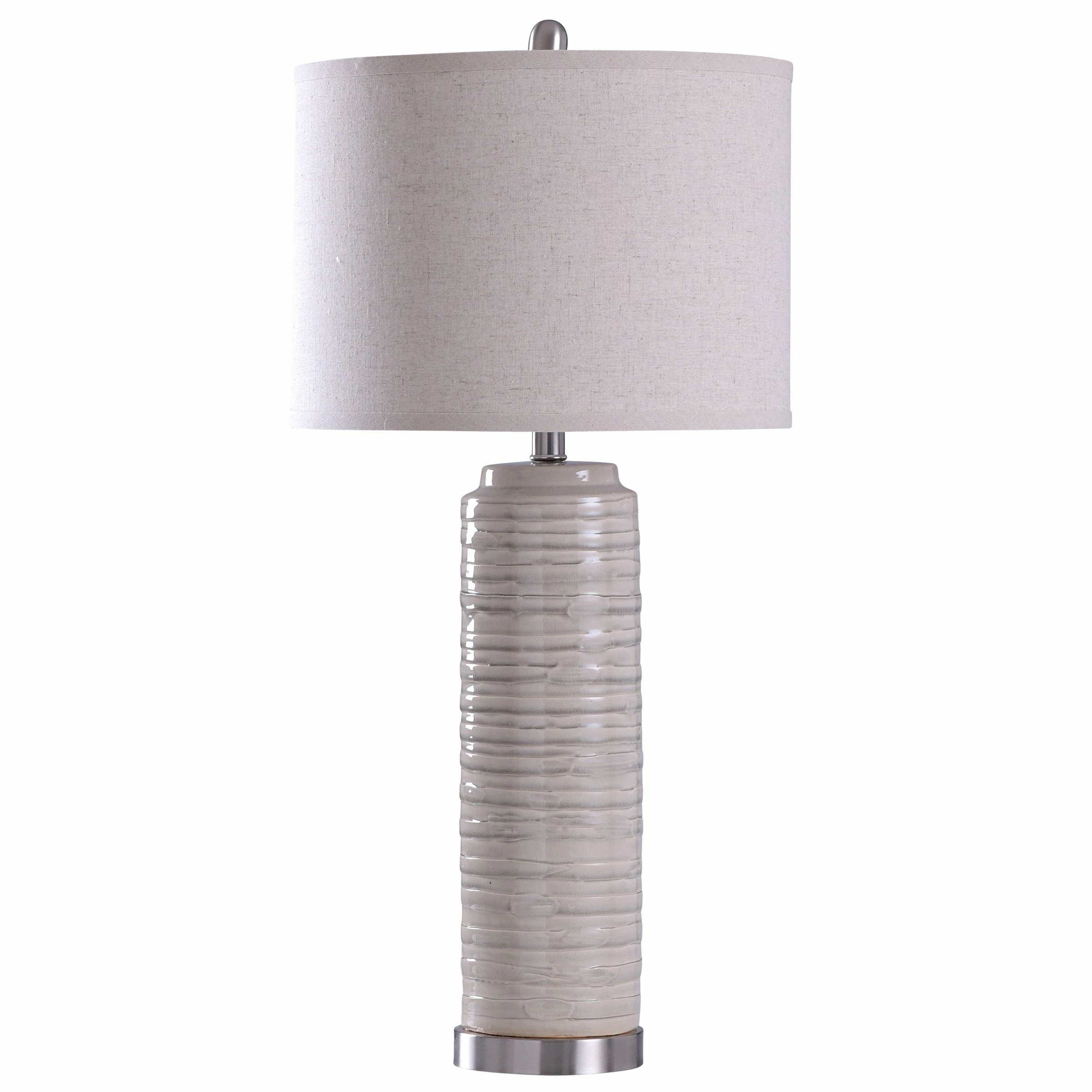 This ceramic and steel table lamp uses a ridge base motif to create a simple look. Topped with a hardback shade, its ceramic elements are artisan handcrafted by Meijiaying. This Table Lamp comes in a beige ceramic and steel frame with an off white styrene shade; Requires one (1) 150-watt Incandescent E26 base bulb (not included).
