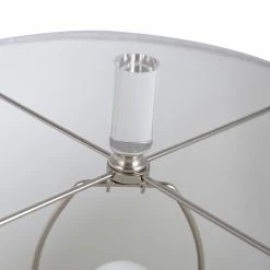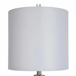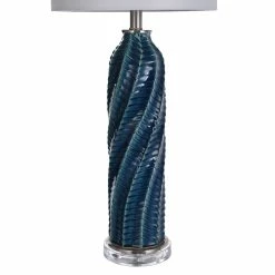 Featuring a clear acrylic base, a glossy blue ceramic frame, and a white shade, the Arezzo table lamp enhances contemporary dΓ©cor in any living room or family room. A textured finish of diagonal swirls on the cylindrical frame showcases varying hues of blue and turquoise. The steel neck of the lamp adds a silver accent, and the clear acrylic finial matches the base.