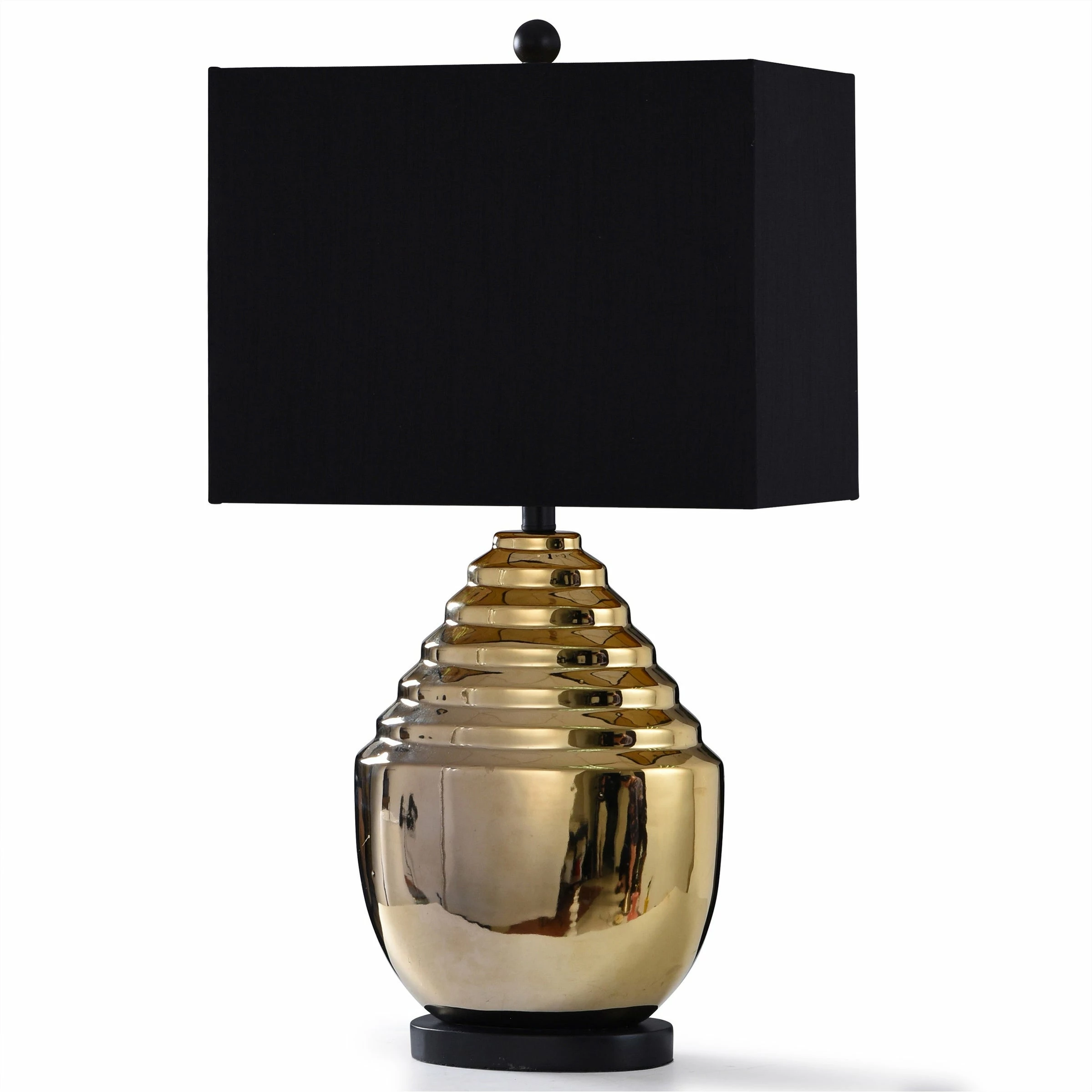 Glam up your living room, bedroom, office, or hallway with this metallic gold Art Deco table lamp. The metallic gold ceramic and dark base come together to pair perfectly with the rectangular black fabric hardback shade and matching finial. There is also a 3-way switch, which helps ensure your space will always be flooded with the perfect amount of ambient light.