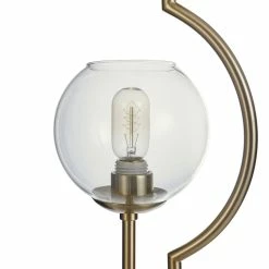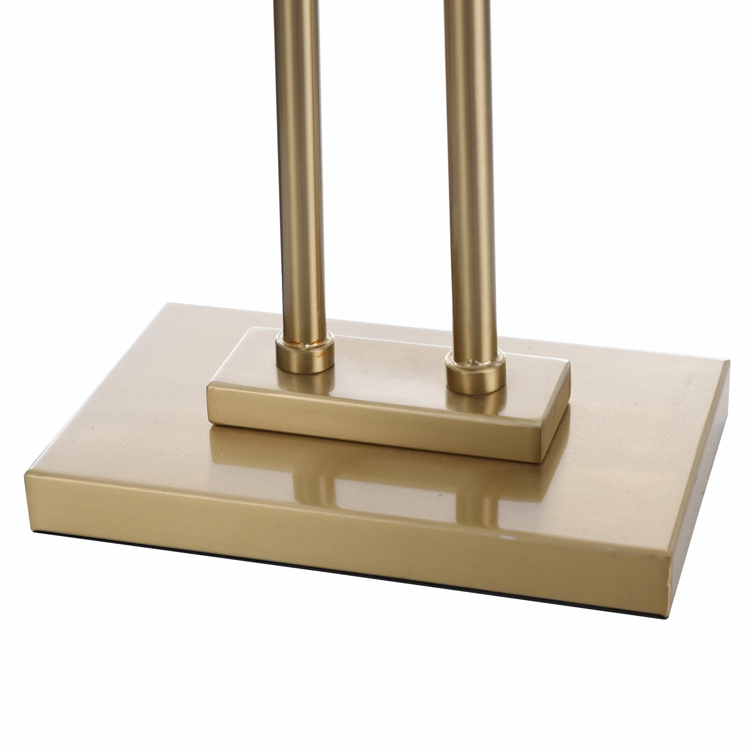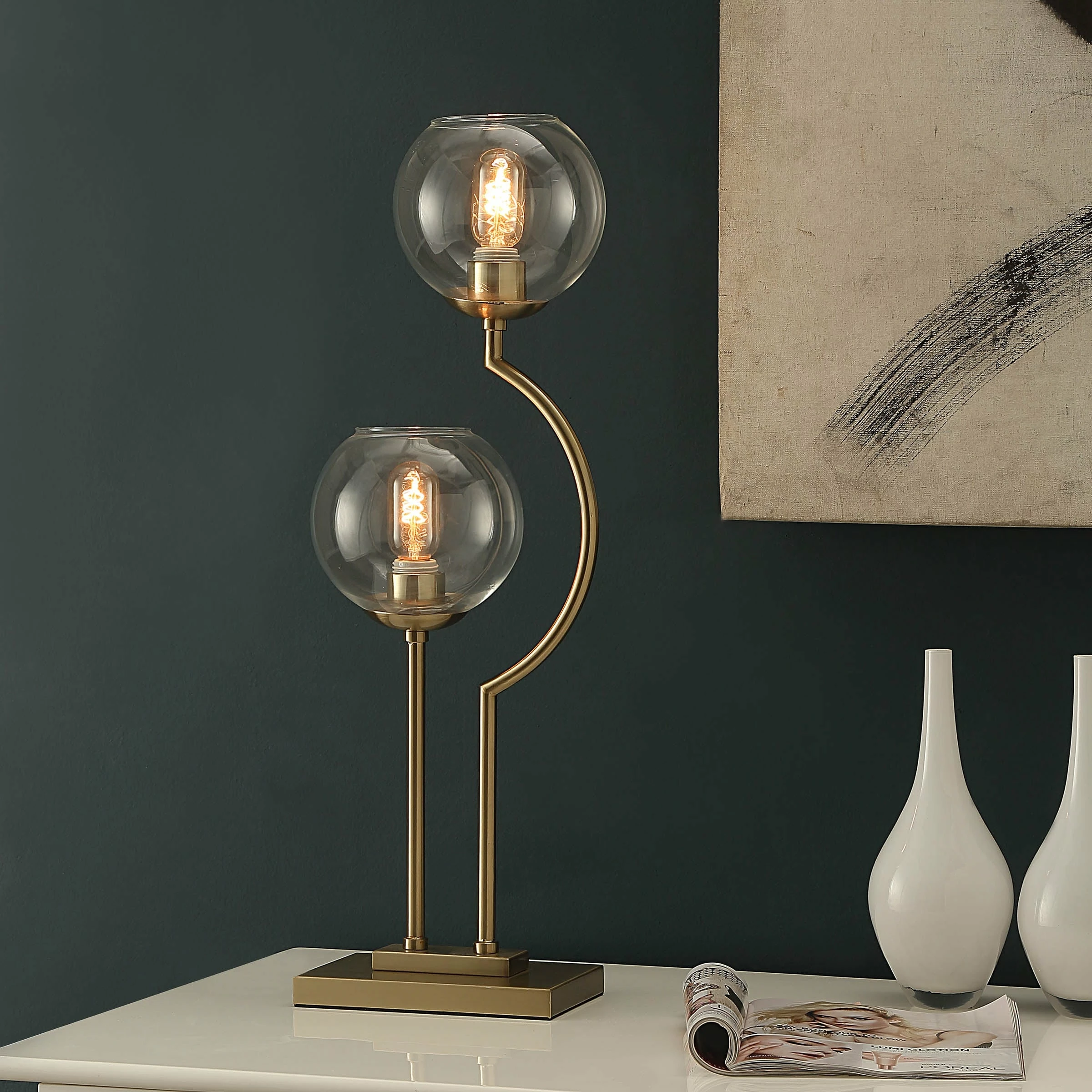 The modern Ashington table lamp has an uplight-style design with two brass poles, each of which supports one light bulb in a clear glass globe shade. The frame’s two poles sit on a rectangular brass base, and their different heights increase this lamp’s visual appeal. Bold design and a convenient cord switch make this brass table lamp ideal for a living room or family room.