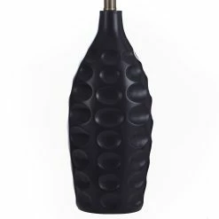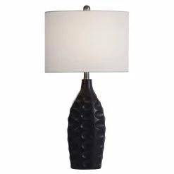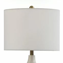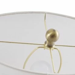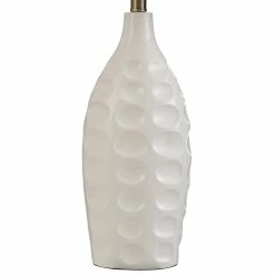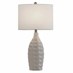 The Banbury table lamp is a transitional fixture with a molded frame, a white shade, and brass accents. Atop the white drum shade is a brass finial that matches the metal neck of the body. The dimpled texture on the frame makes this contemporary ivory lamp an eye-catching accent for a living room or family room.