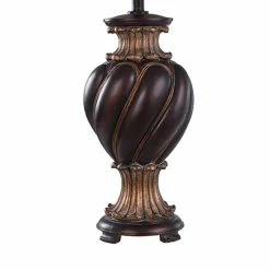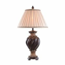 This refined vintage favorite is a must have for lending a sophisticated aesthetic to any tabletop. The Barbados table lamp is crafted using dark brown finish on an elegant twisted body with top and bottom accenting. It’s completed with a slow tapered hardback fabric shade in khasi silver with matching brown accent bands.