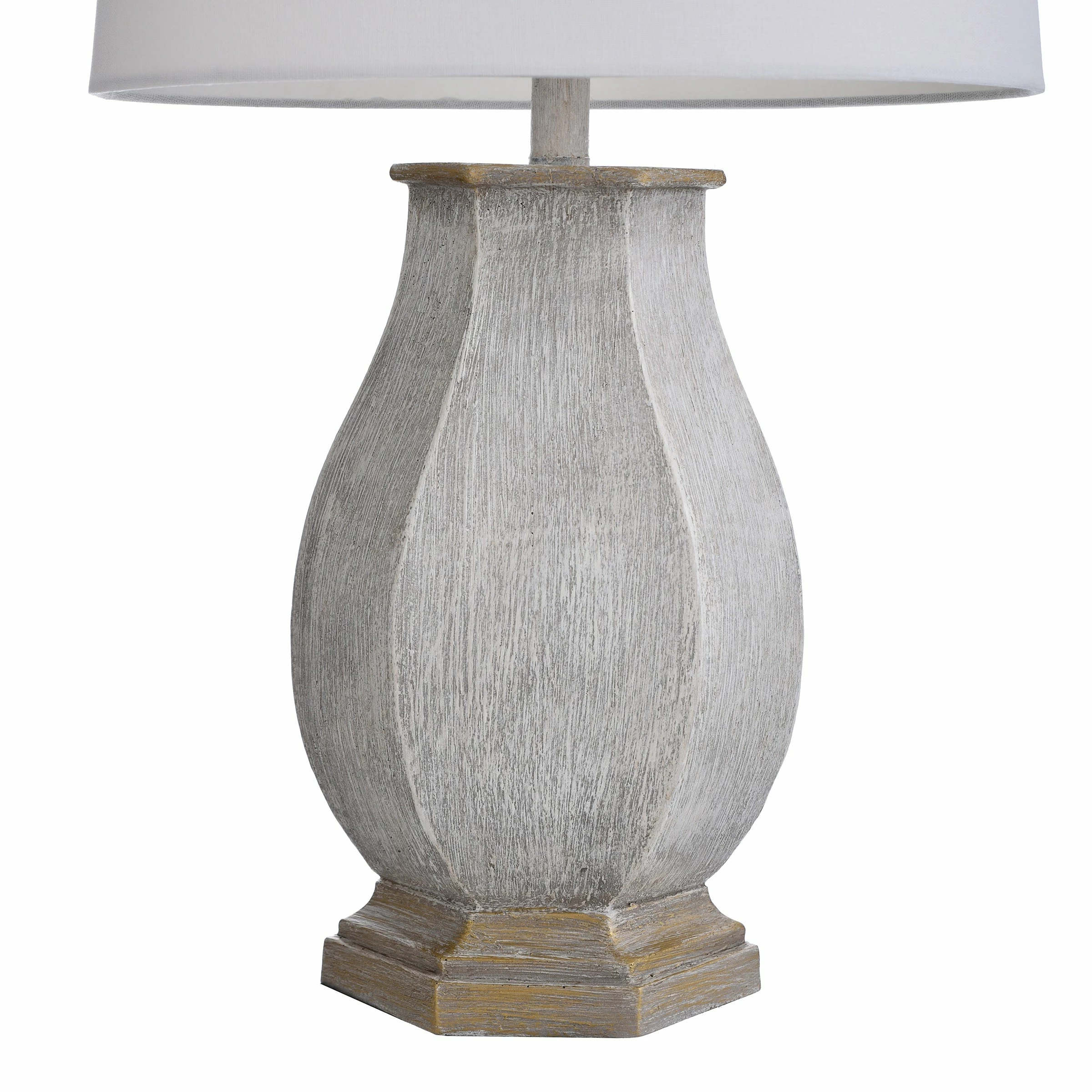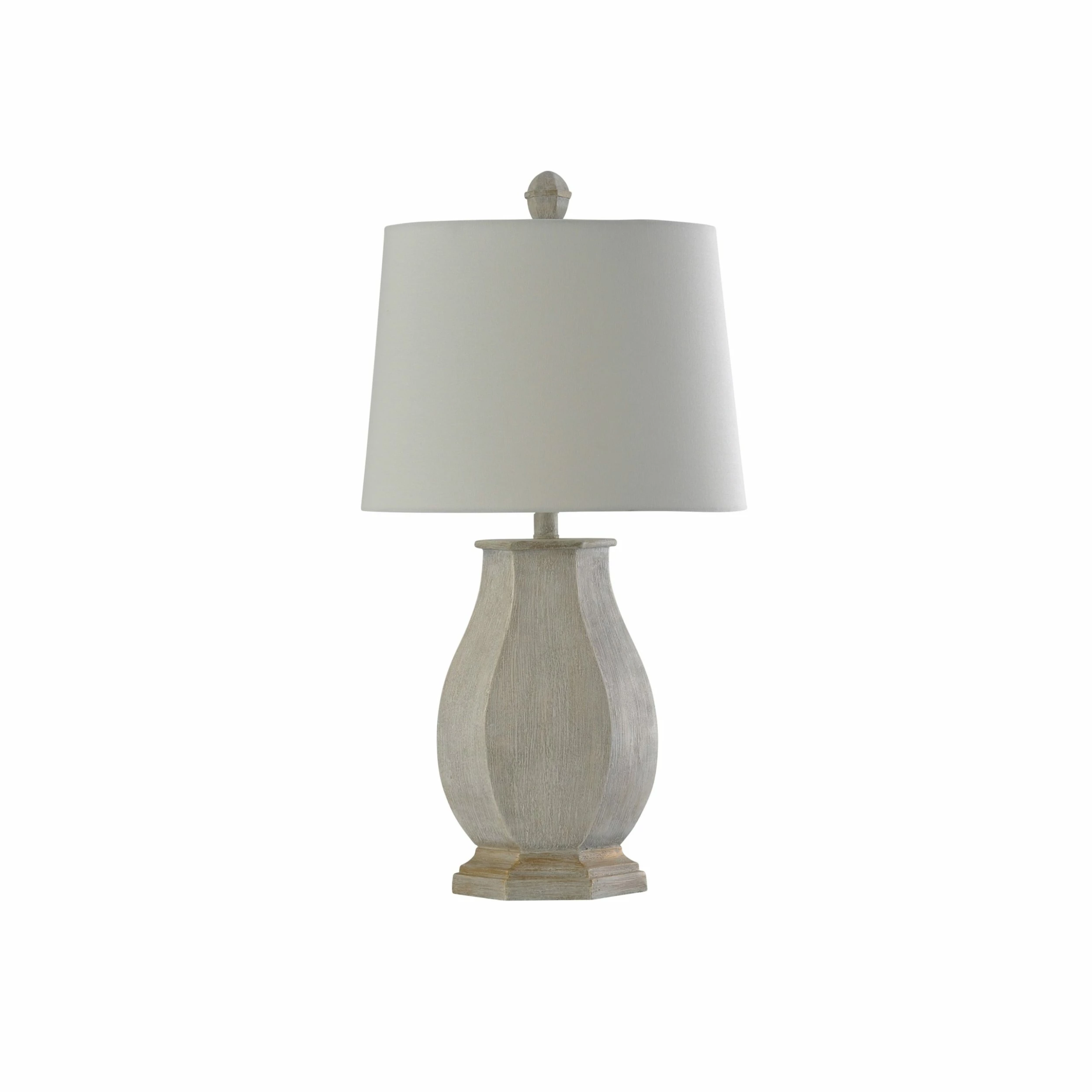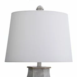 The Table Lamp comes in a basilica sky poly base with white hardback fabric shade; Requires one (1) 100-watt Incandescent E26 base bulb (not included).