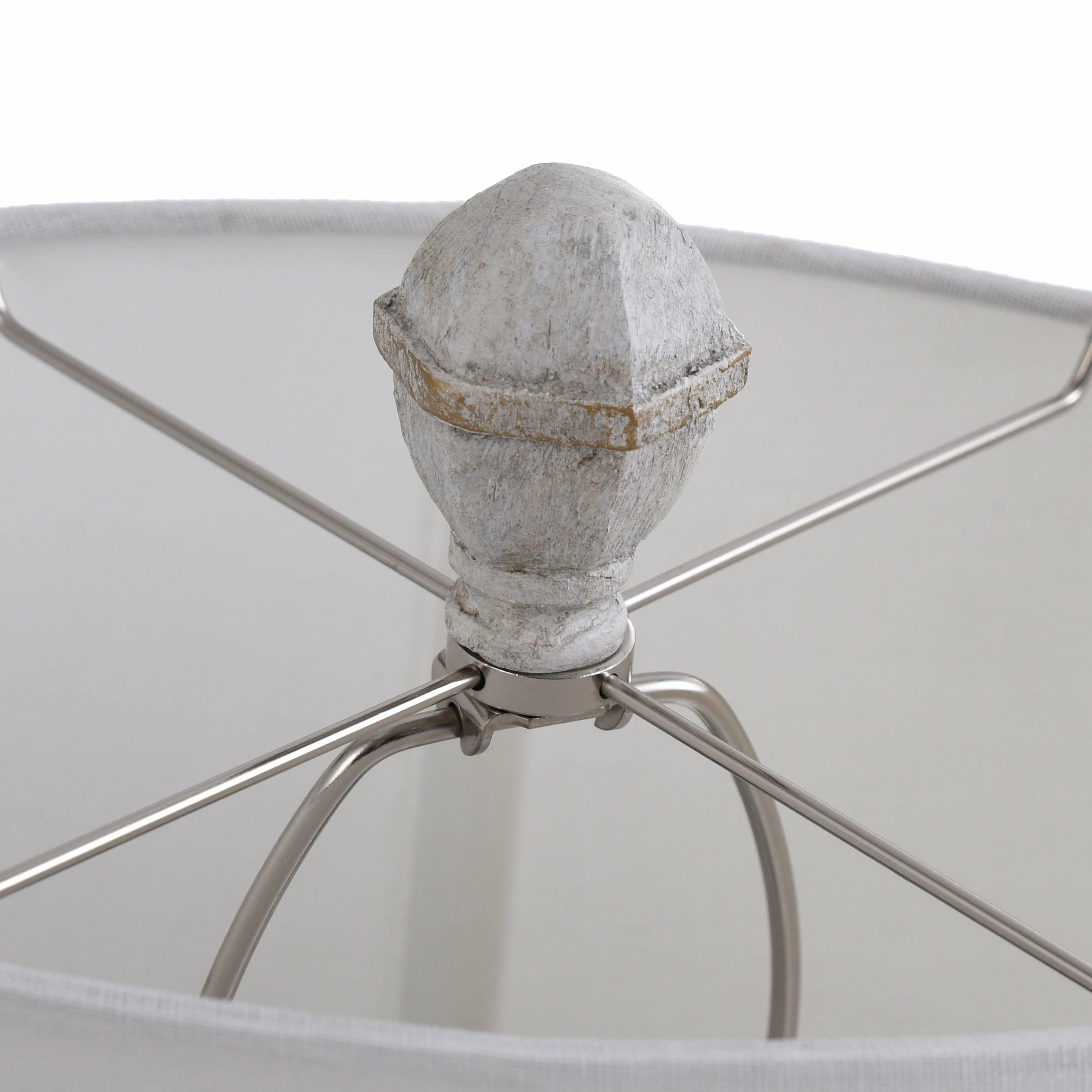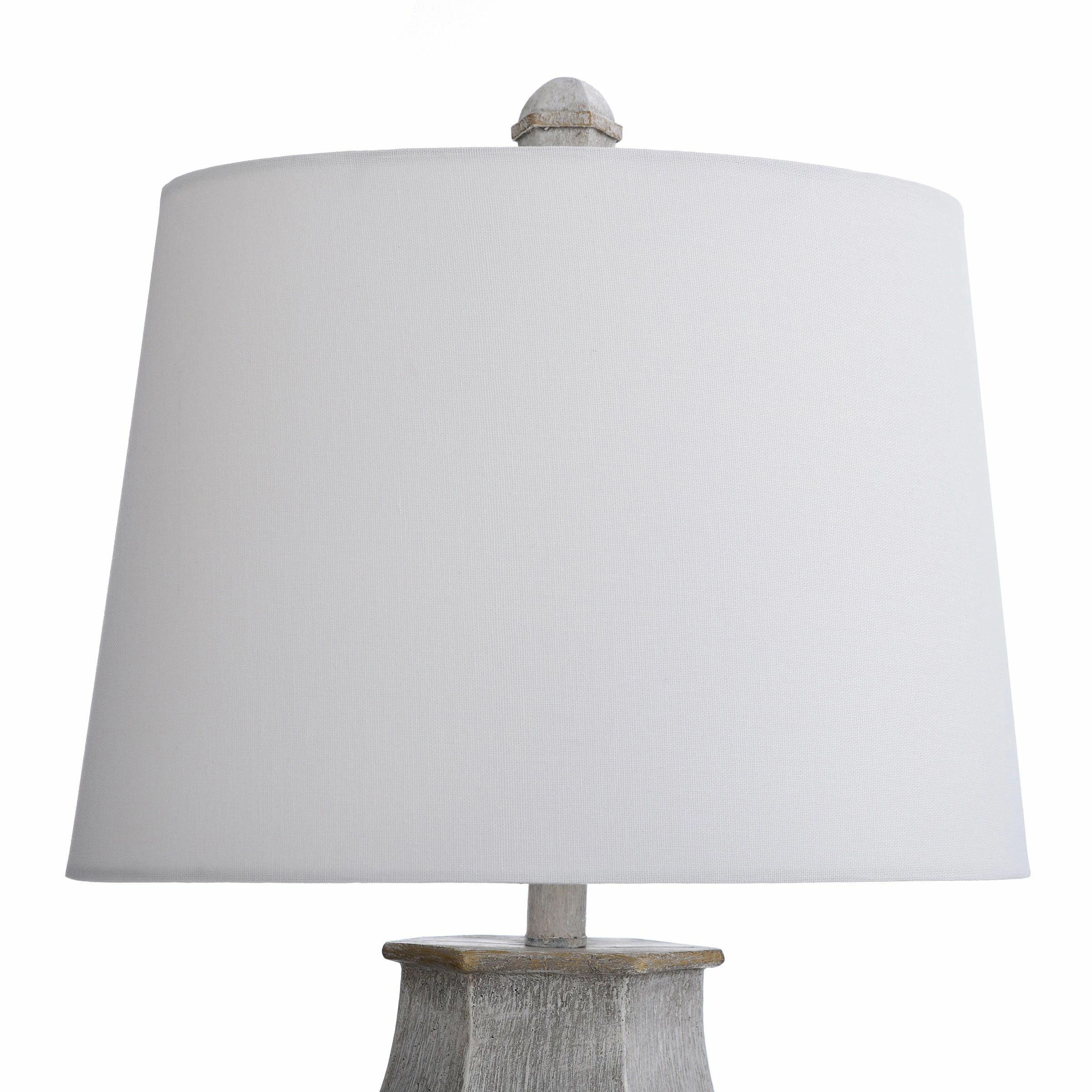 This subtly weathered Basilica Sky table lamp draws influence from vintage styles and softened tones to create a unique transitional look. Made for a softer contemporary aesthetic, this lamp is crafted using a custom basilica sky finish that’s topped with a round hardback shade and matching finial. It features square lines and round touches to give it the perfect profile for living rooms and bedrooms.