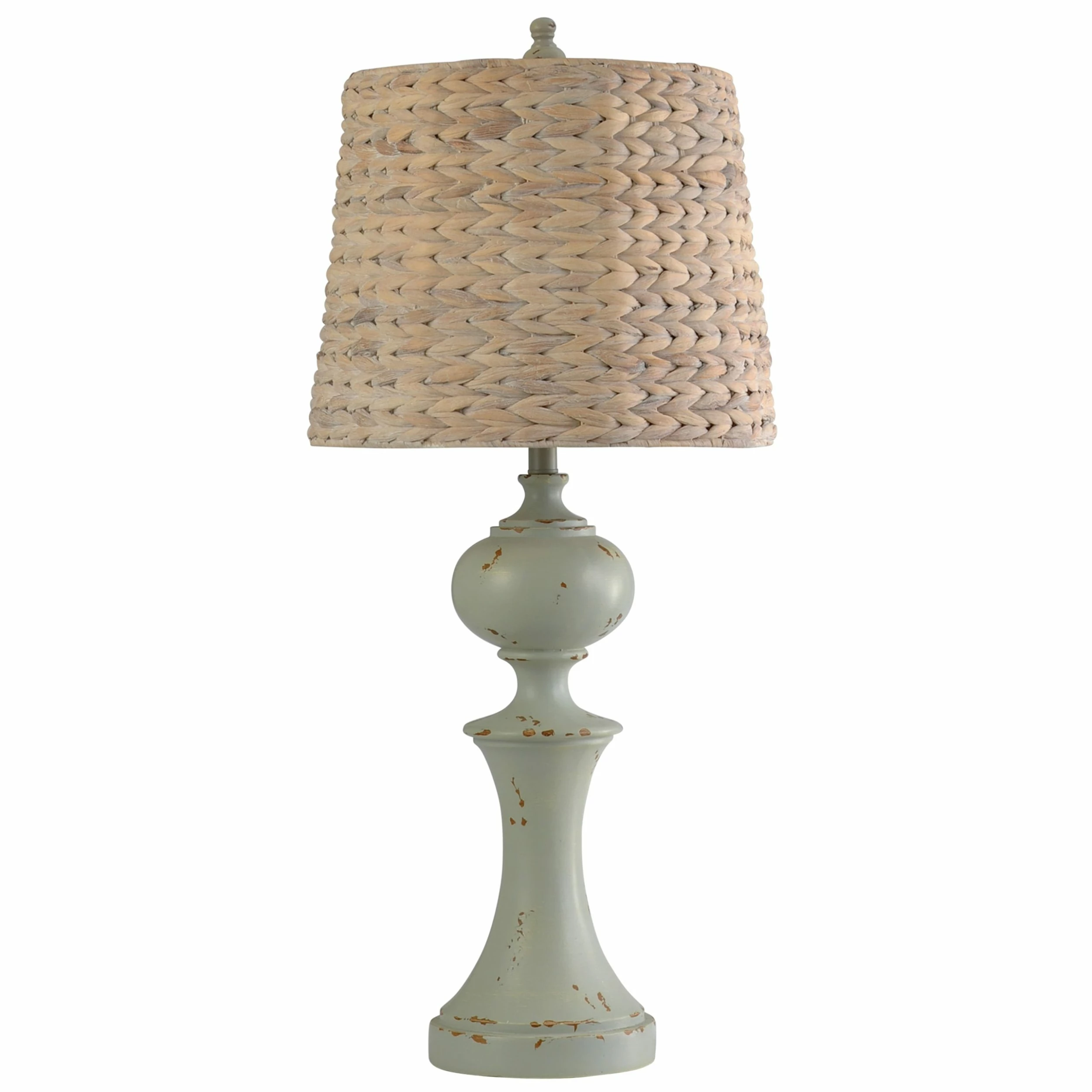 This table lamp comes in a basilica sky finish with natural shade; Requires one (1) 150-watt Incandescent base bulb (not included).
