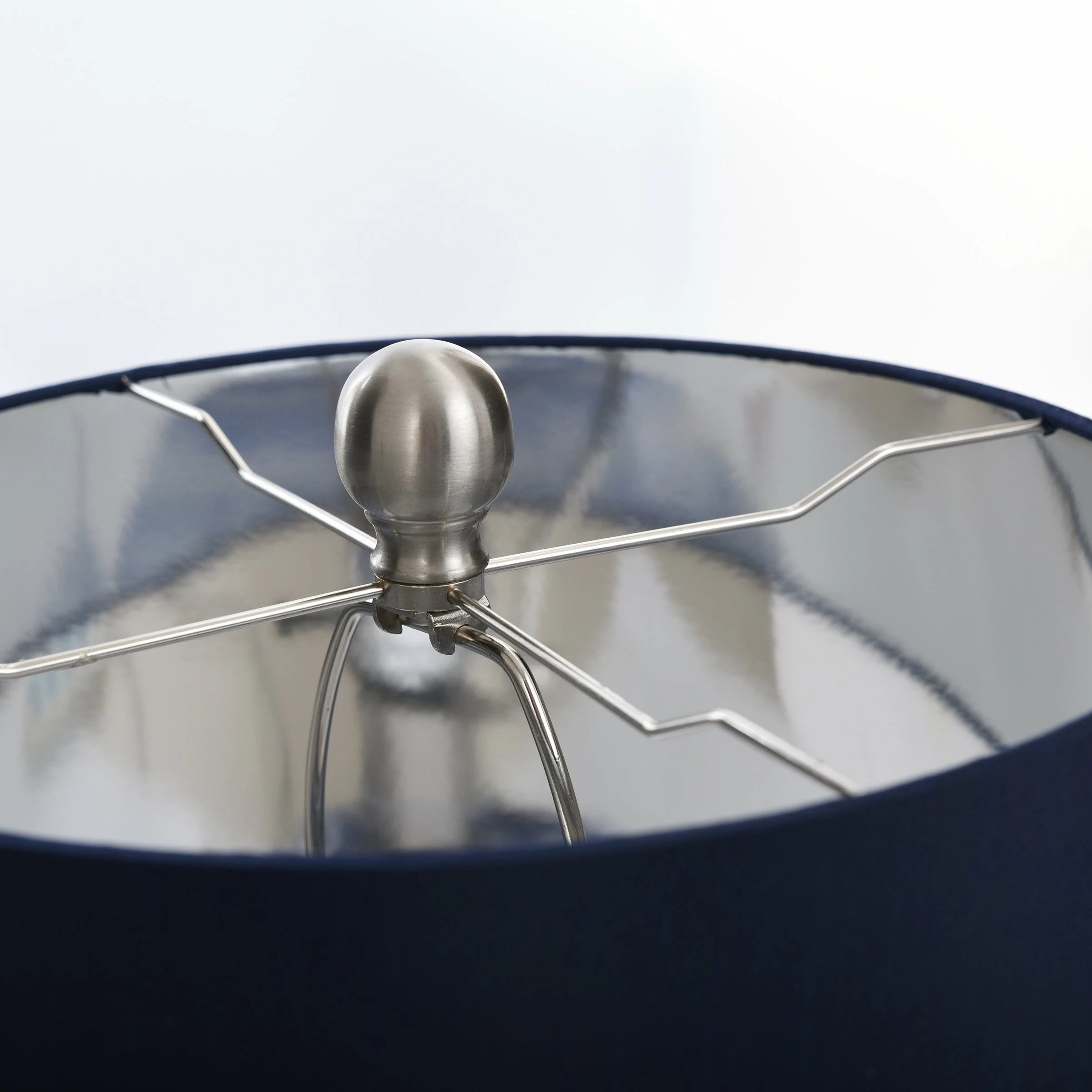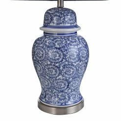 The ceramic frame of this ornate lamp features a blue ivy pattern over a white background. There is a silver finial that matches the base and a dark blue fabric hardback shade. This blue and white table lamp supports three-way operation, so it’s ideal for a hallway, bedroom, office, living room, or dining room.
