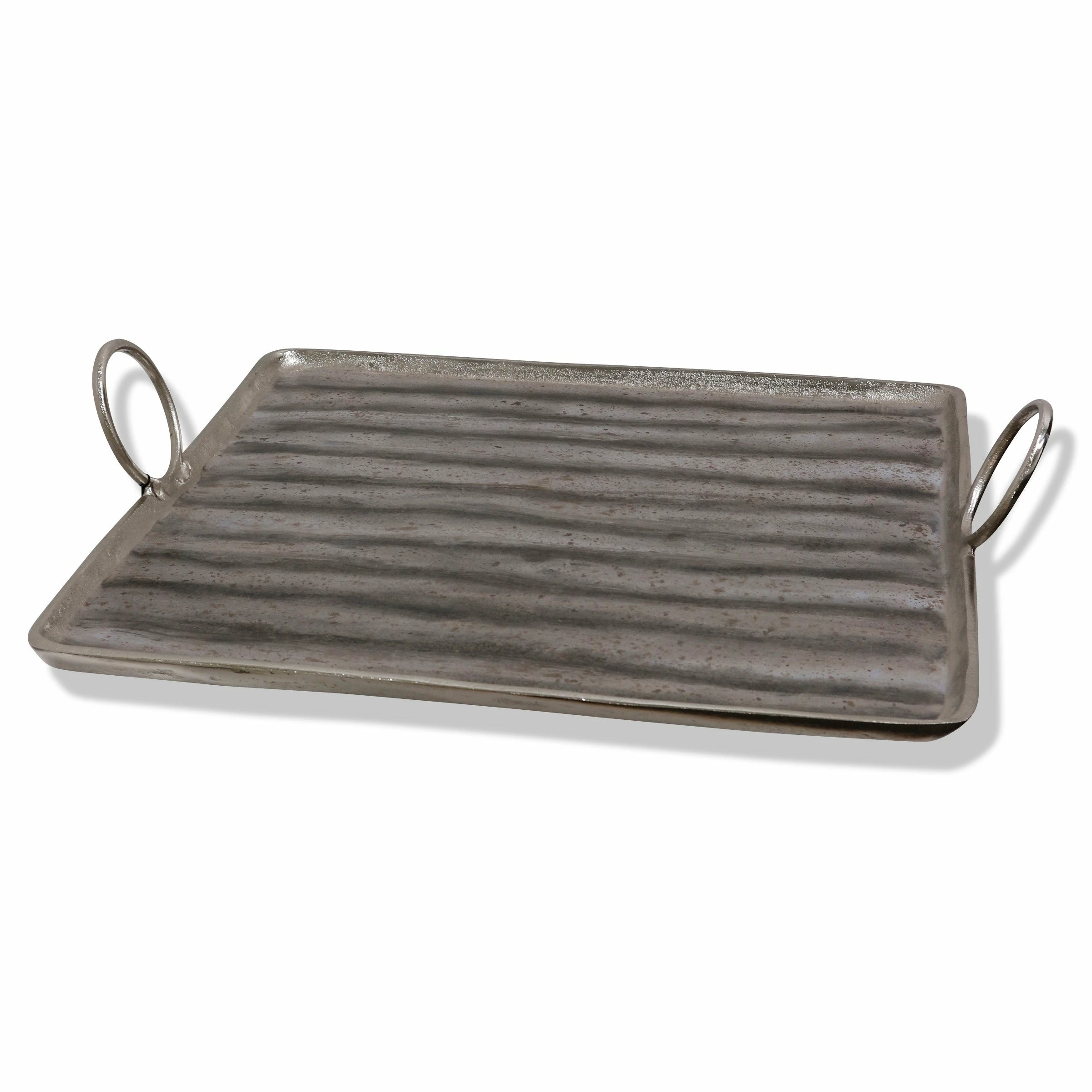 This aluminum tray has an antique vibe and understated design, a subtle silver piece ideal for decorating living room and dining room surfaces. Thin circular handles on either side give the frame a graceful touch, contrasting the durable aesthetic of the India metal. The elegant finish and reserved design allow this tray to serve as an accent in virtually any setting.