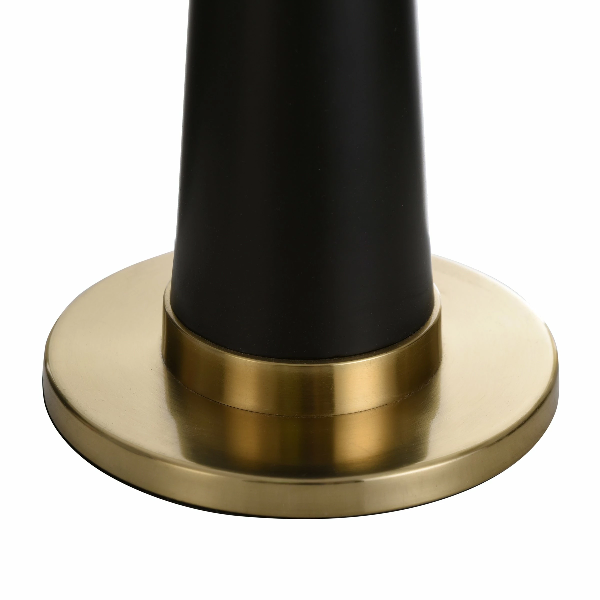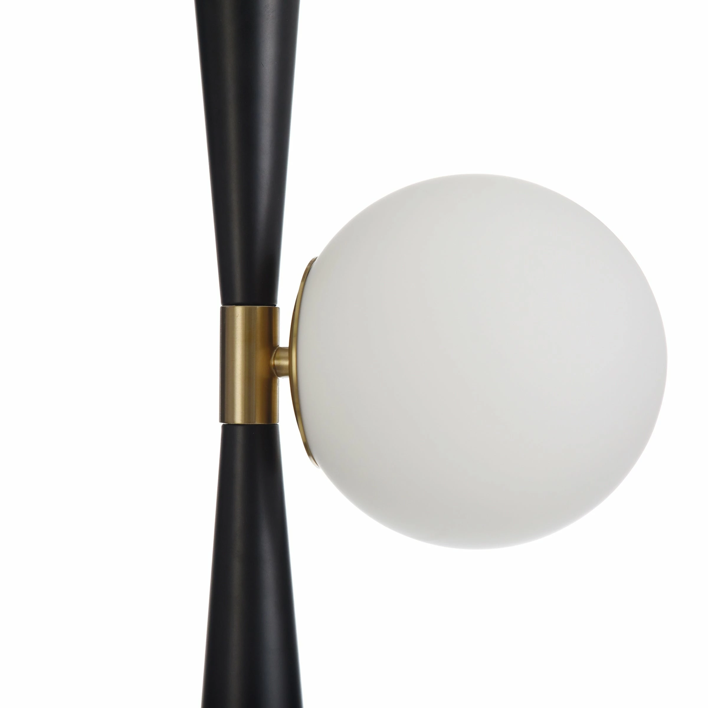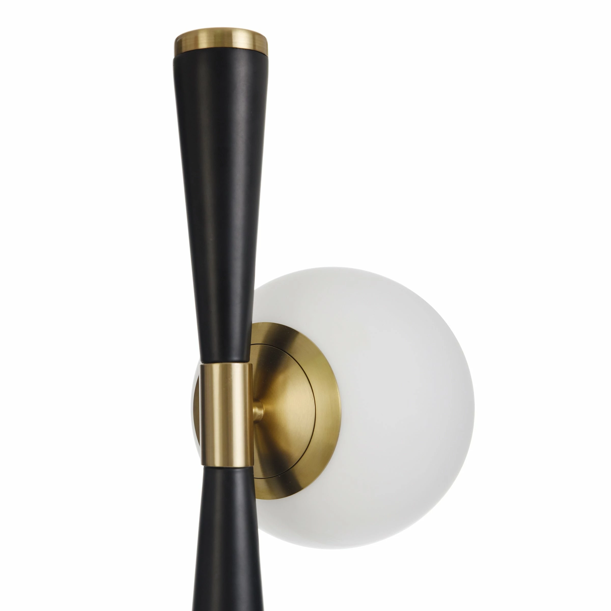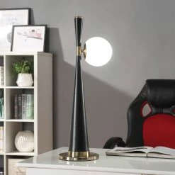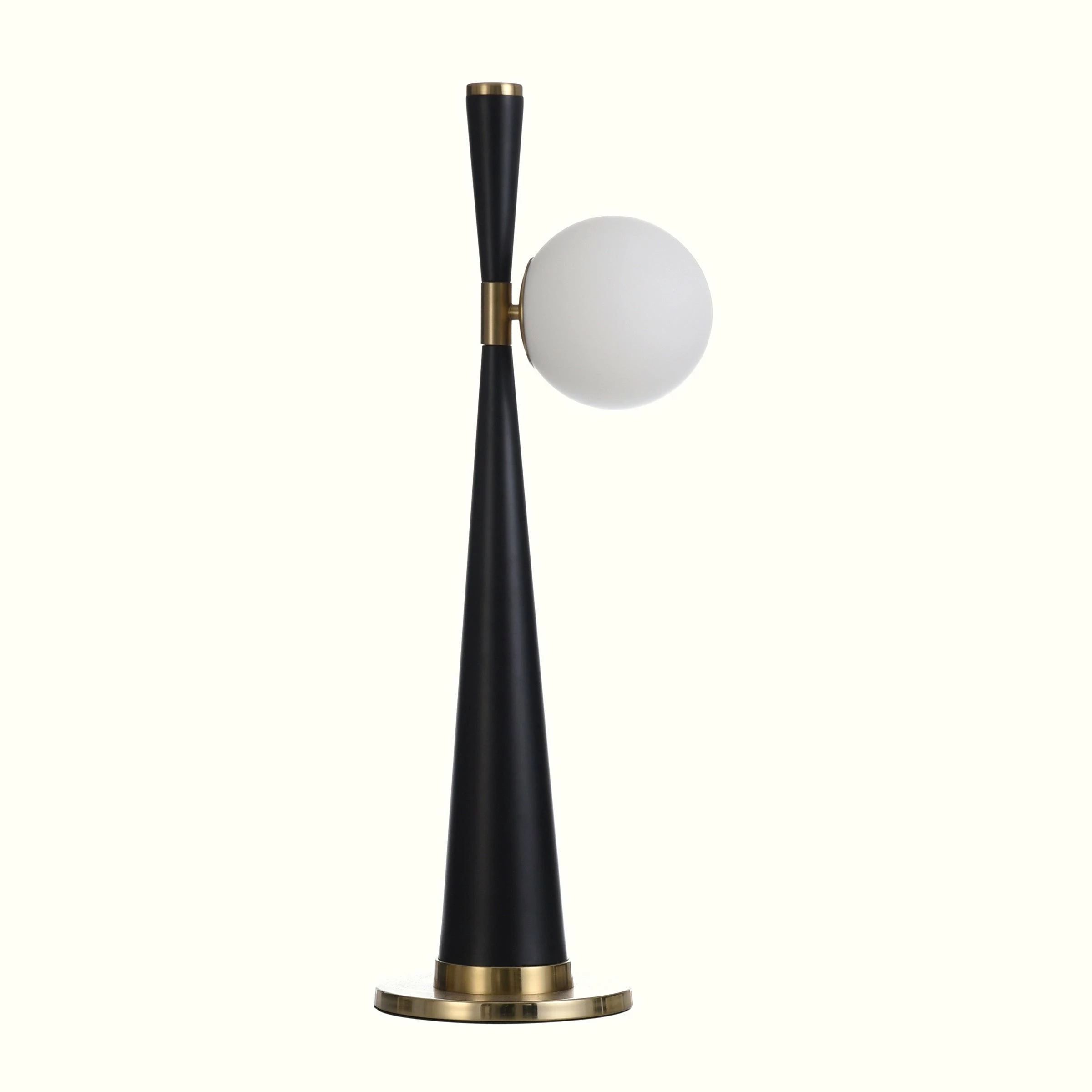 With its black tapered frame, gold accents, and white frosted glass globe shade, the Brigg table lamp is a singular example of contemporary design. The slim black frame sits on a lustrous gold base, and the glass shade is attached at the narrowest point of the tapered frame. The unconventional shape and bold color scheme make this lamp a striking accent for a family room or living room.