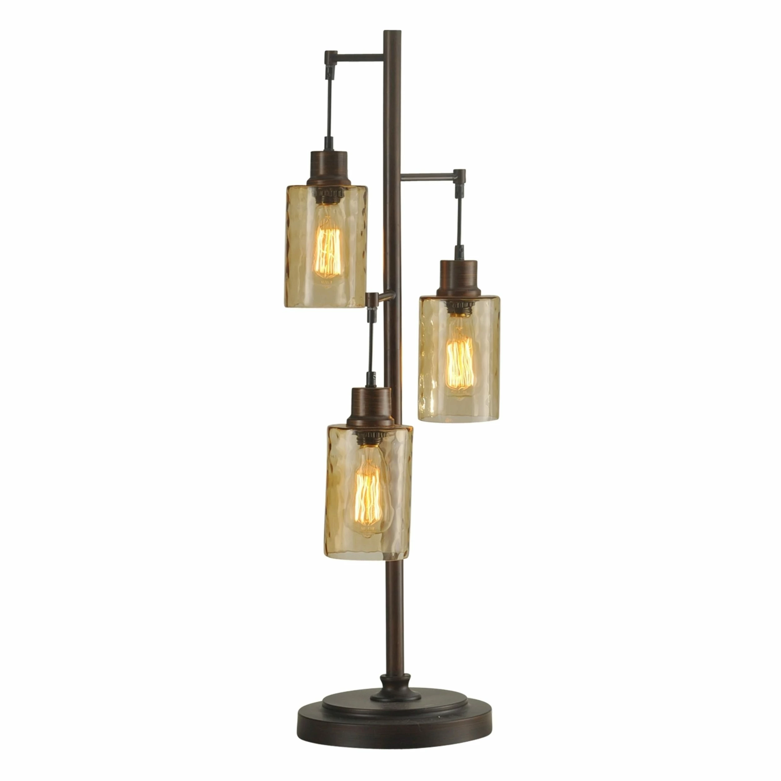 The Bronze with Champagne Pendant Dimpled Glass Shade Table Lamp makes for a unique addition among your other living room furniture. The three shades are made of clear dimpled glass and are suspended from the steel body finished in bronze. This item is equipped with three 40-watt Edison bulbs.