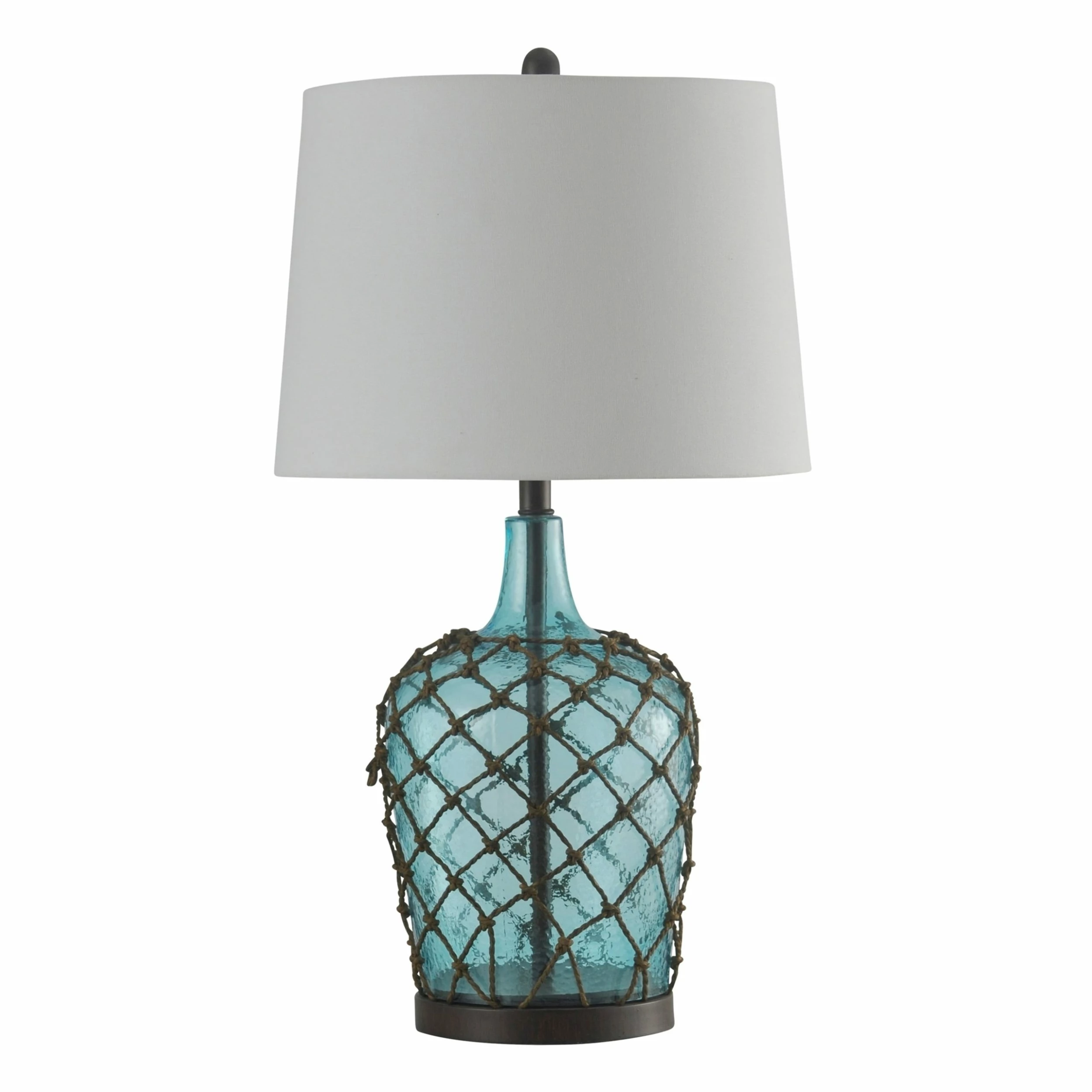 This Table Lamp comes in a cayos blue glass, steel, rope frame with a white hardback fabric shade; Requires one (1) 150-watt Incandescent E26 base bulb (not included).