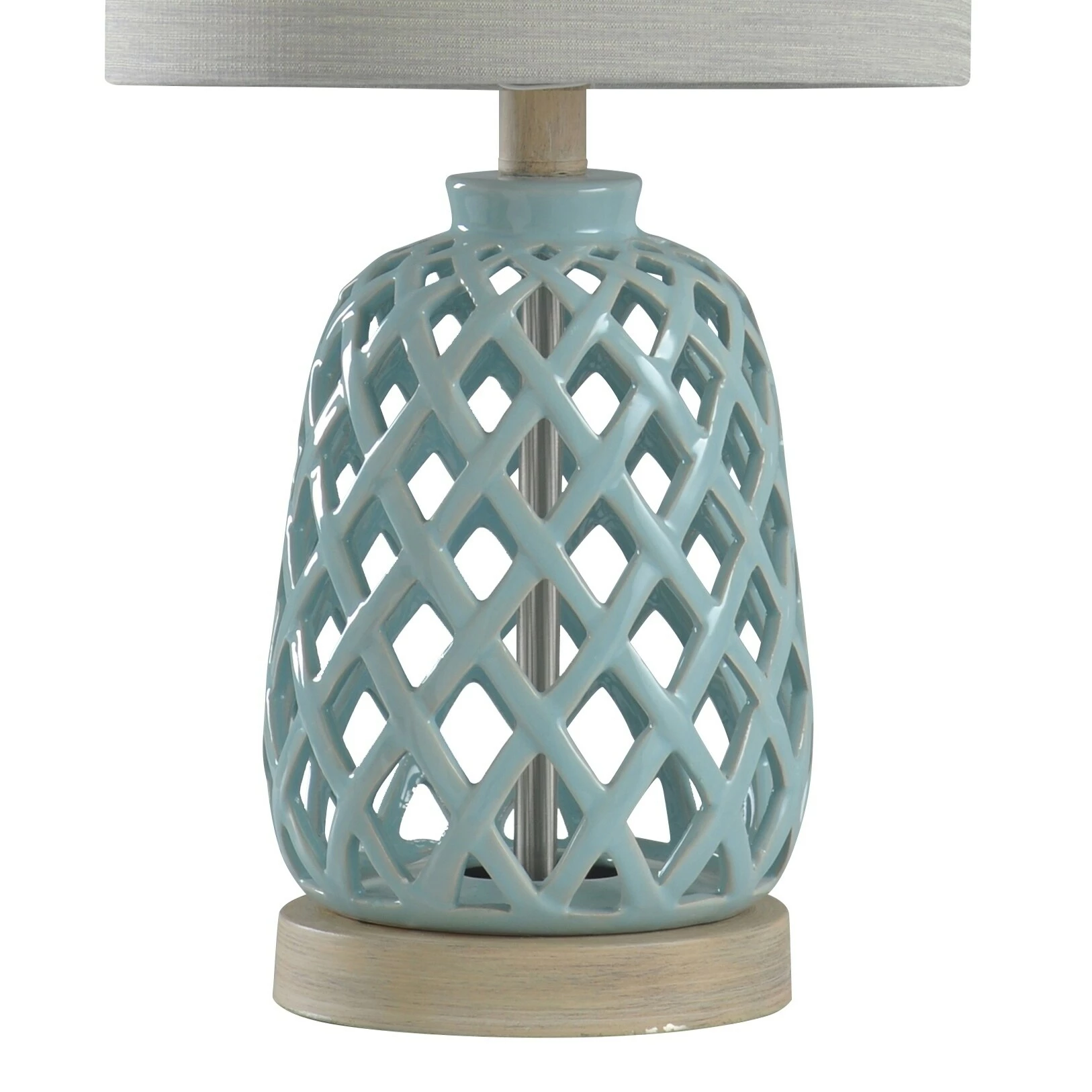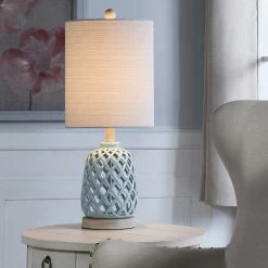 A cool new take on a vintage style, this ceramic table lamp is finished in a soft blue for a standout quality that’s equally easy to match. Made to meet exacting artisan standards, this lamp is designed with an open lattice body and fabric hardback shade in white. It’s a bold selection for bringing life to tabletops throughout your mid-century inspired decor.