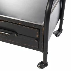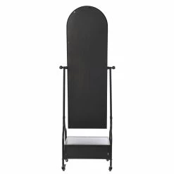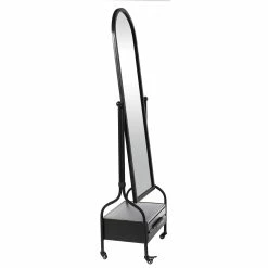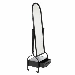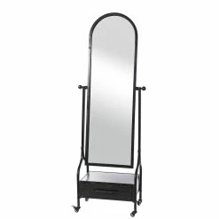 This cheval mirror comes with a lower storage drawer. The mirror comes in a blackened grey galvanized finish. The frame is made out of metal material.