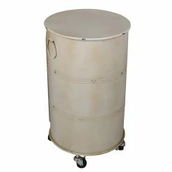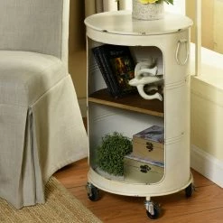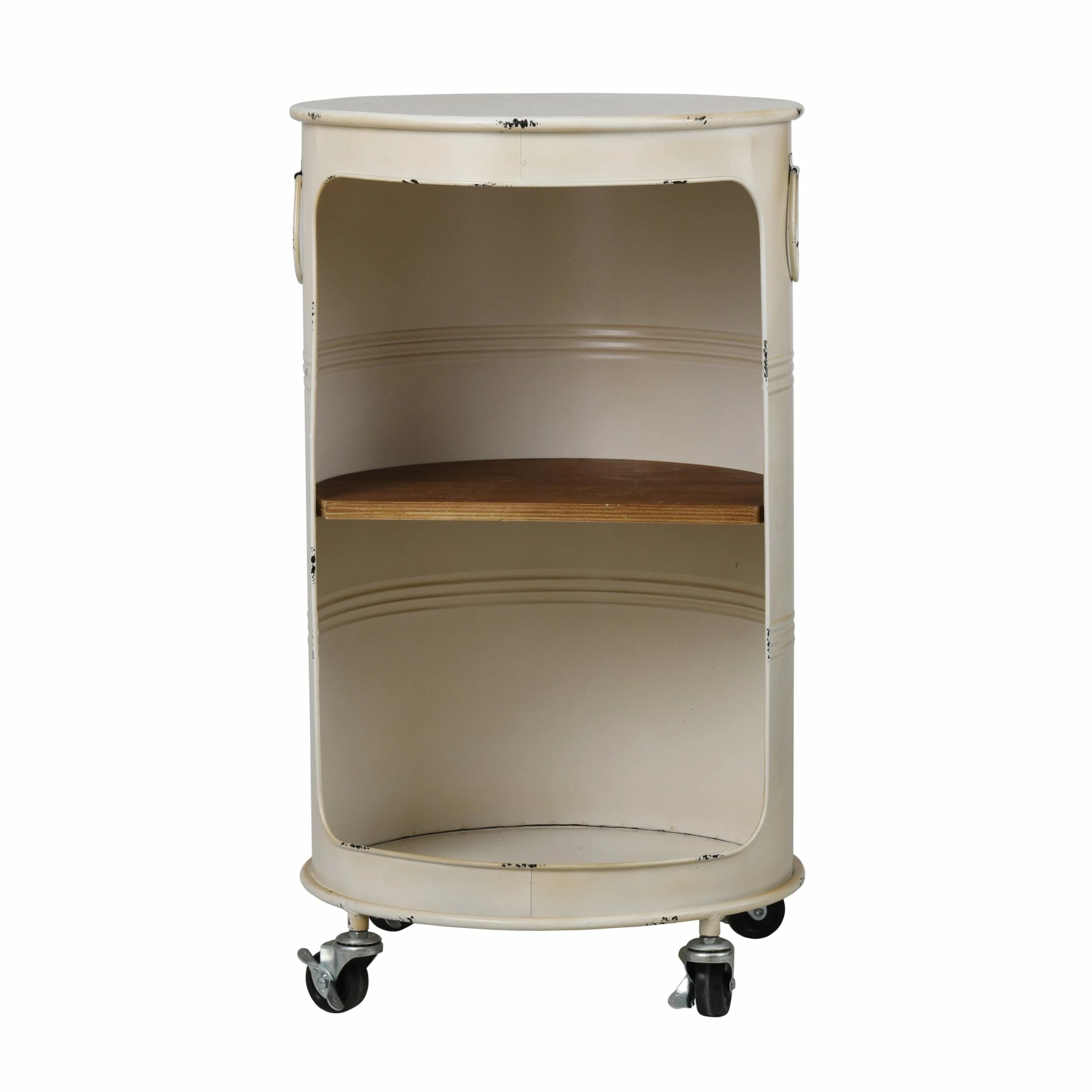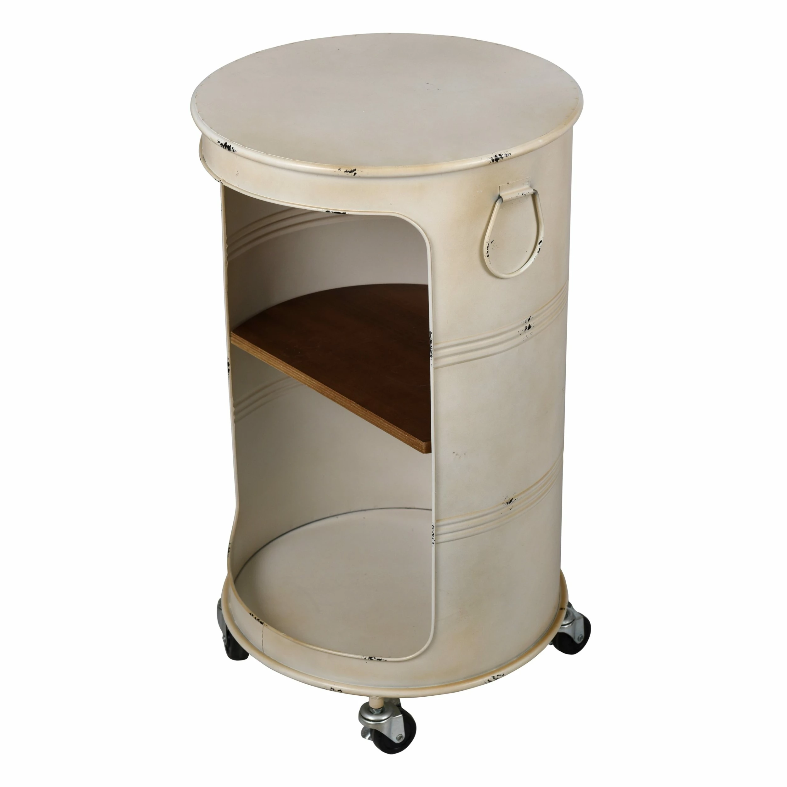 Give your room an edgy industrial look with this white metal Church St. Side Table, which mimics a barrel. The wheels let you roll it around a space easily, making it useful in a studio or garage. The table has one wooden shelf, so the vertical space makes it a great storage spot for decorative items.