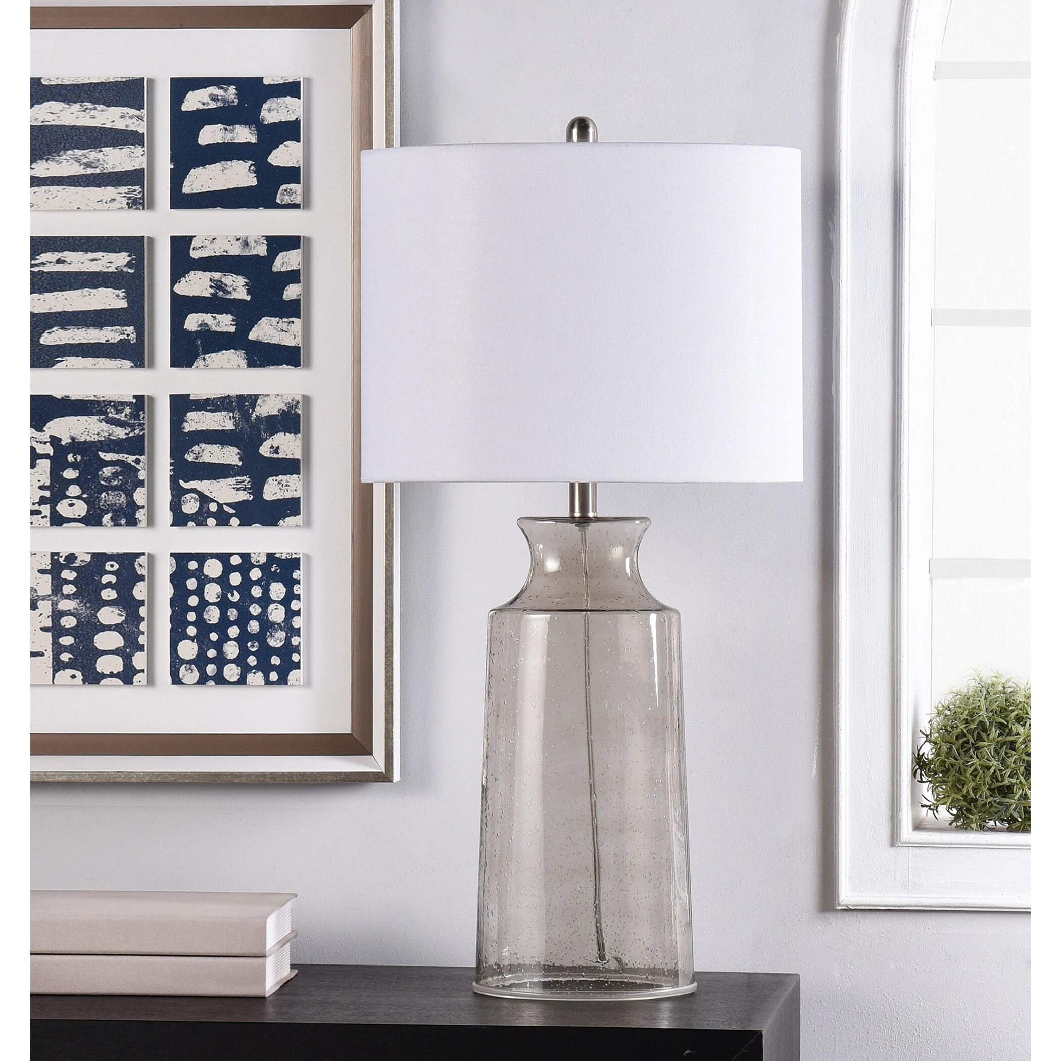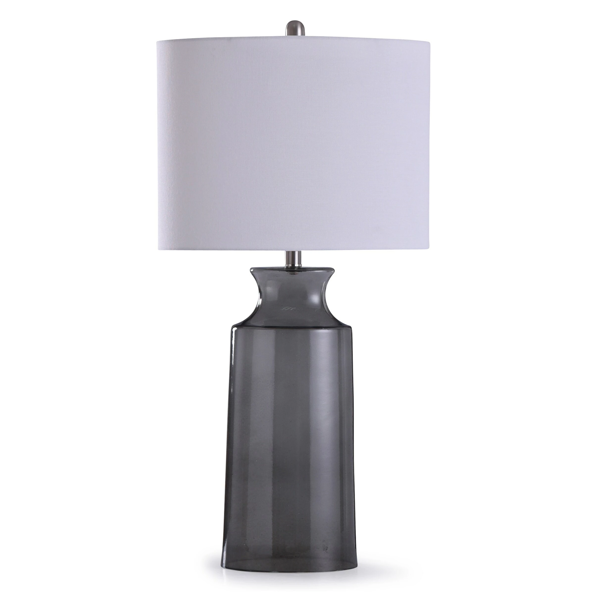 Smooth lines and a gorgeous gray and white color scheme make the transitional Clove Table Lamp shine, from its smoked gray glass frame to its white fabric shade. This elegant lamp has a cylindrical frame with an open bottom base and hourglass-shaped top. With its sleek appearance, this elegant gray and white lamp is ideal for a side table or nightstand.