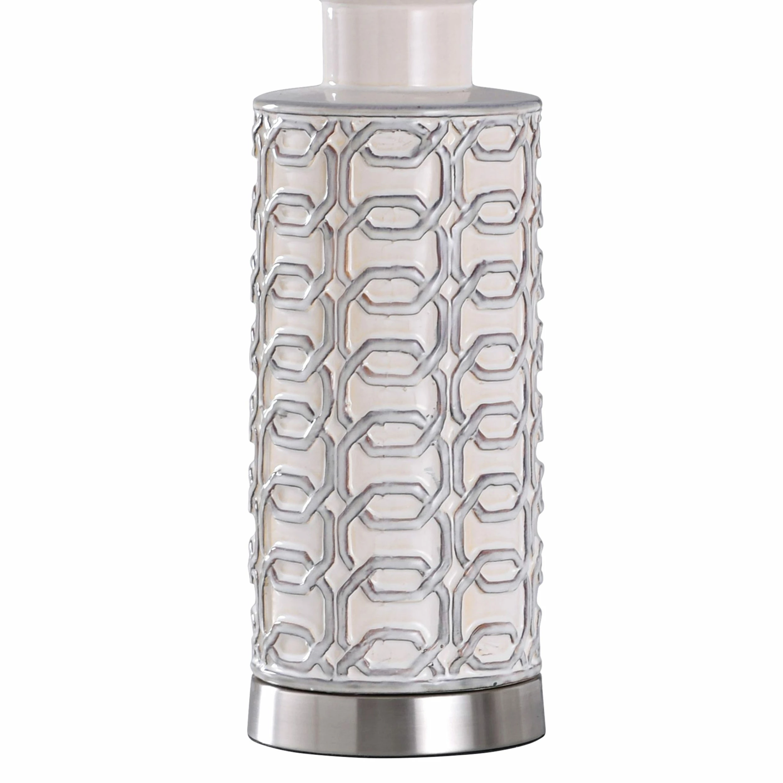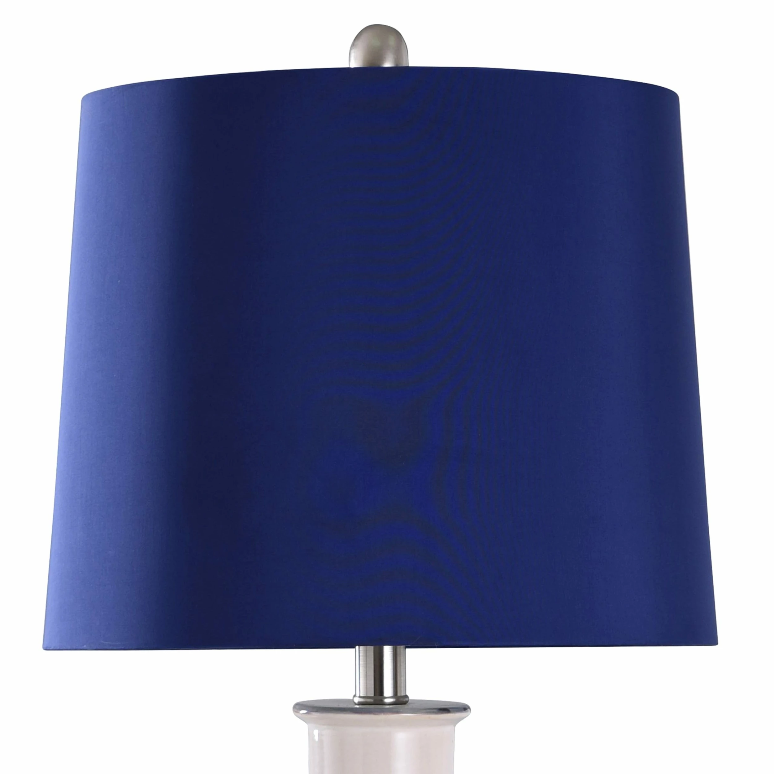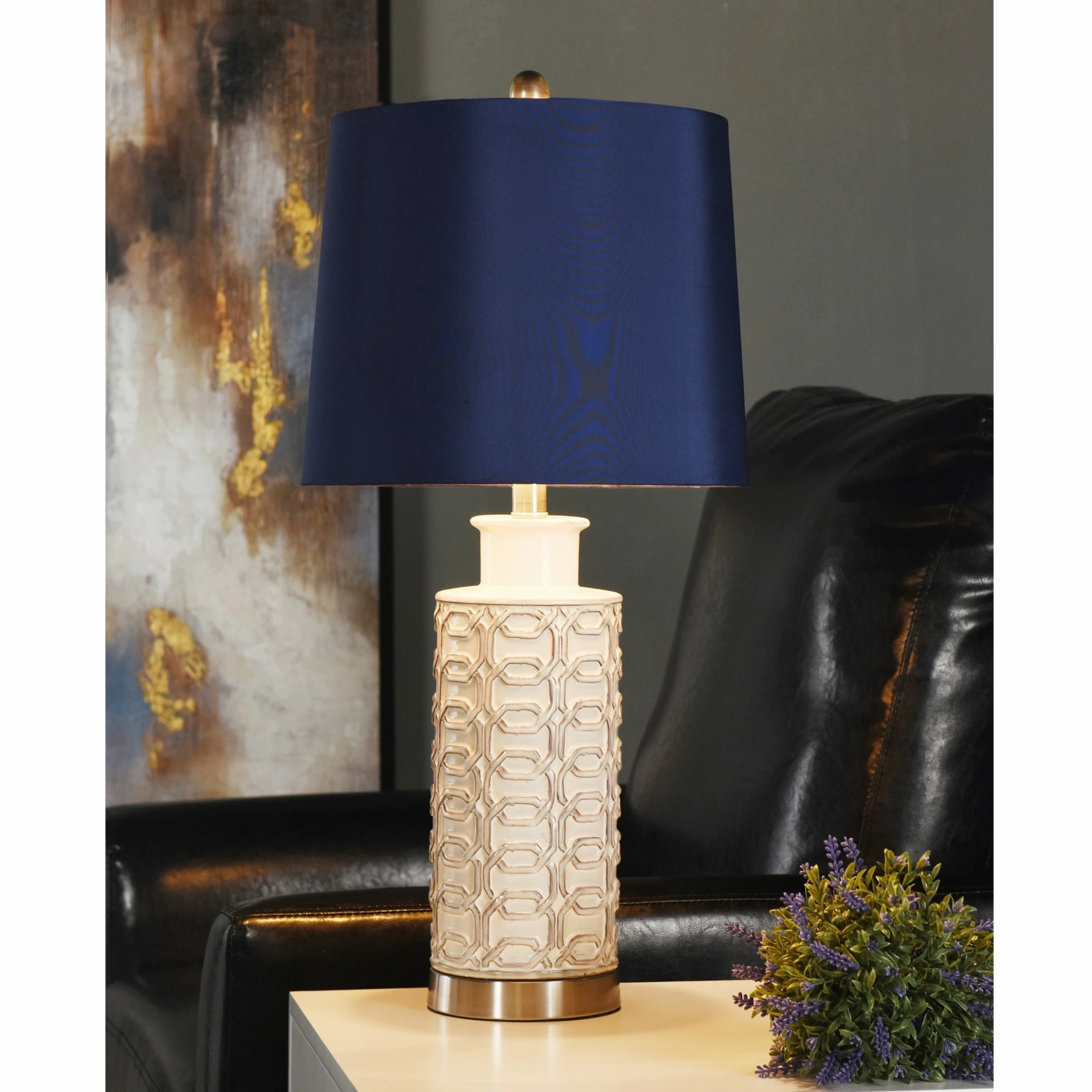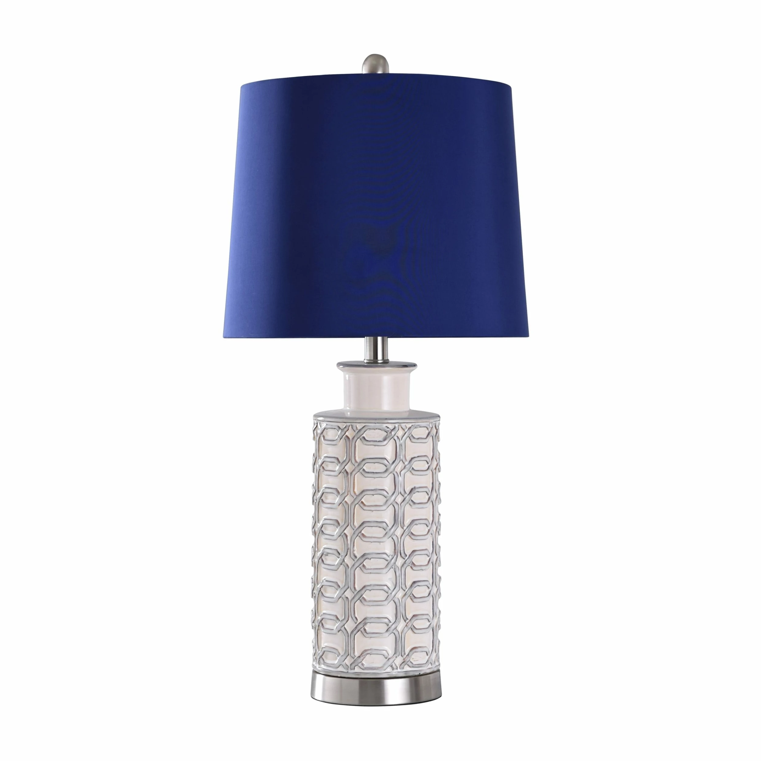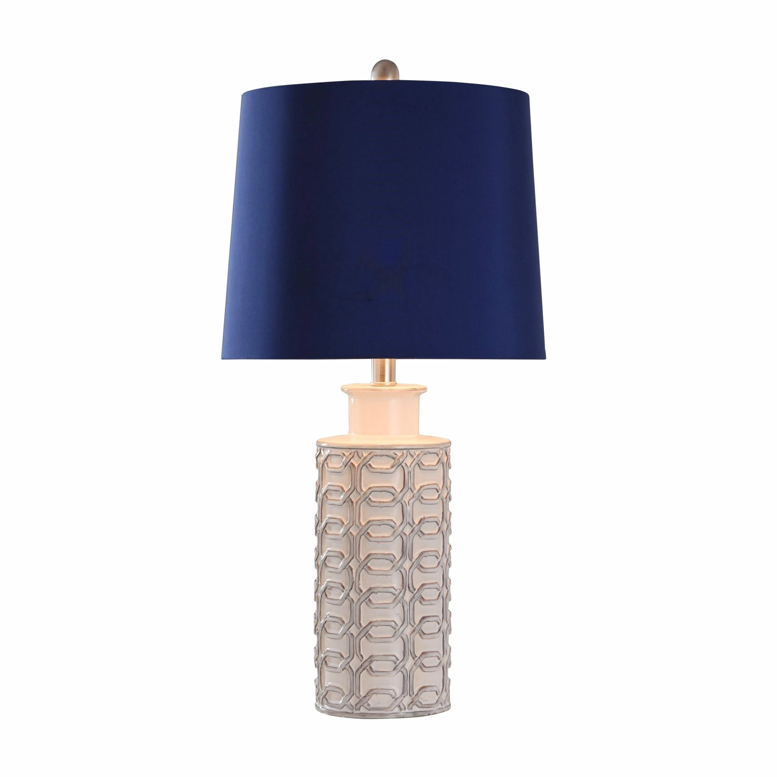 A textured, cylindrical body complements the blue shade of this table lamp. Made of ceramic with brushed nickel accents, this stylish addition looks great on any tabletop, side table, or nightstand. Its neutral look makes it a versatile, elegant choice for many settings.