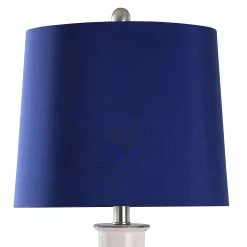 This table lamp comes in a cream and blue and brushed nickel finish with blue shade; Requires one (1) 60-watt Incandescent base bulb (not included).