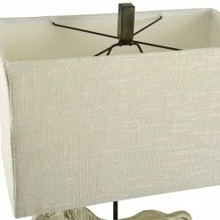 This Table Lamp comes in a dapple gray poly frame with a natural linen softback fabric shade; Requires one (1) 100-watt Incandescent E26 base bulb (not included).