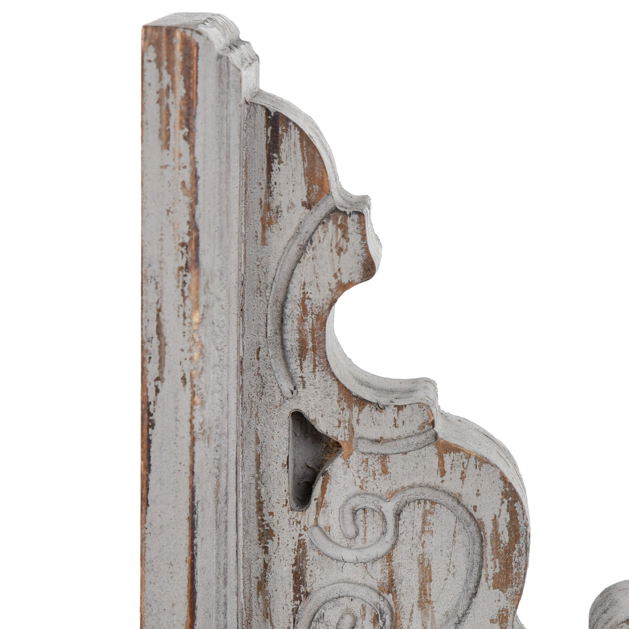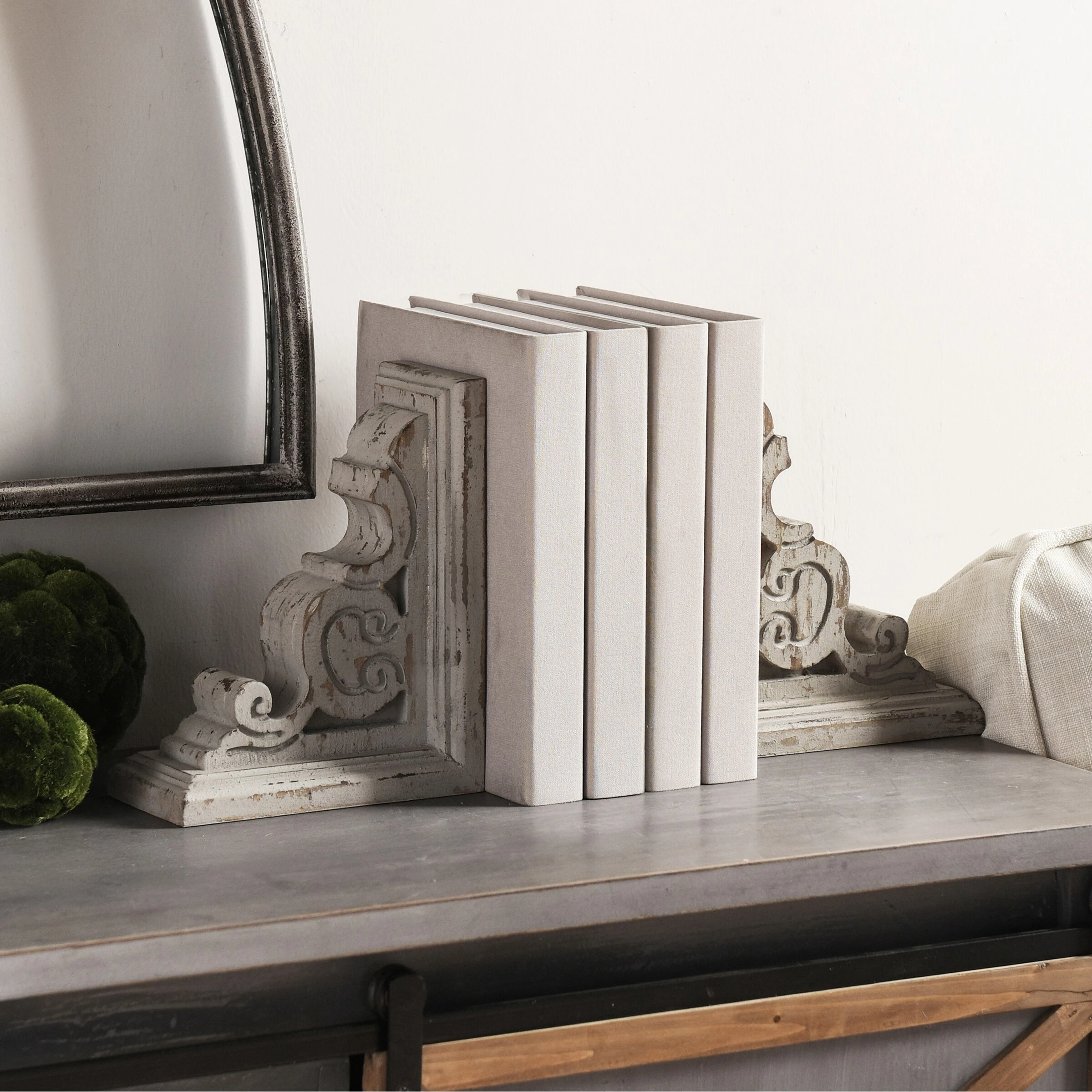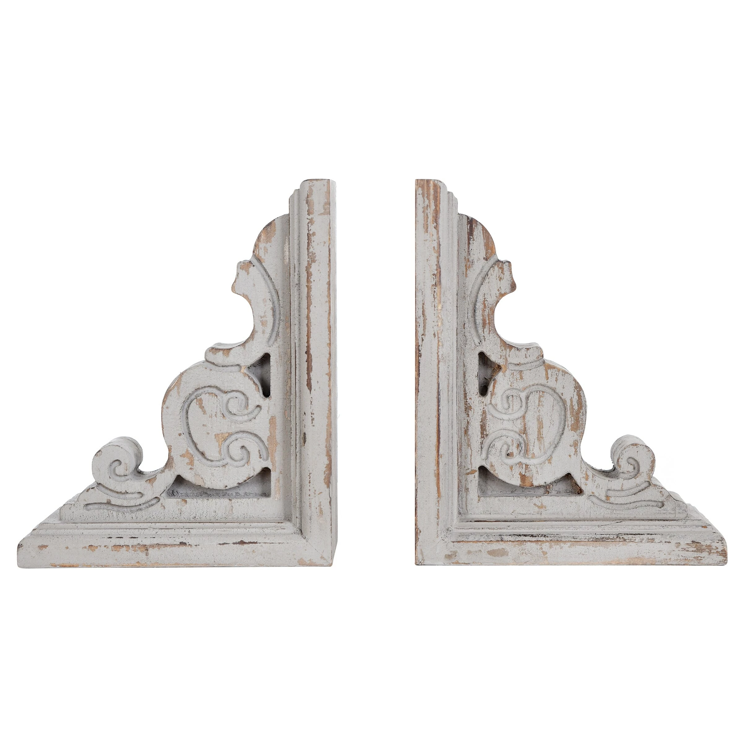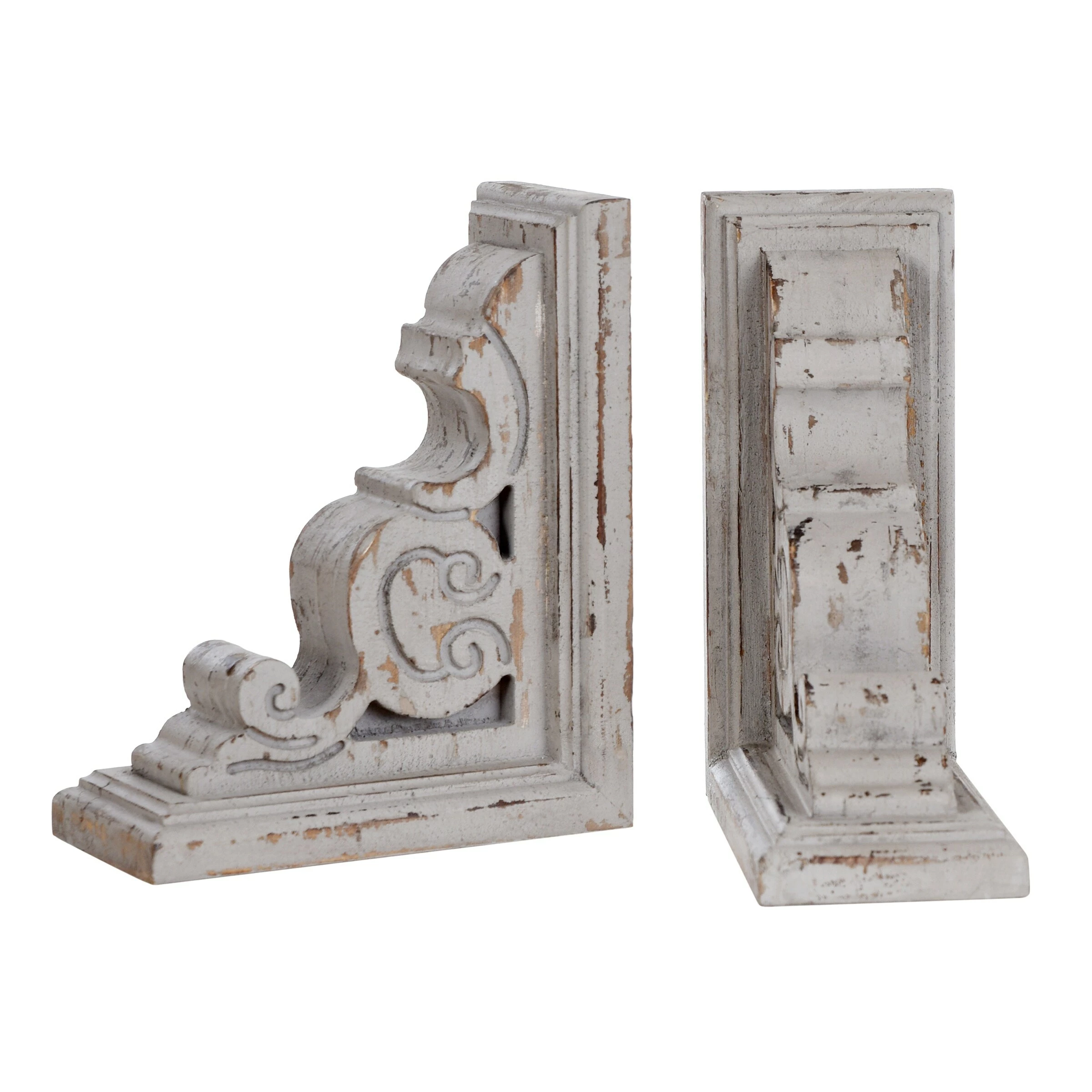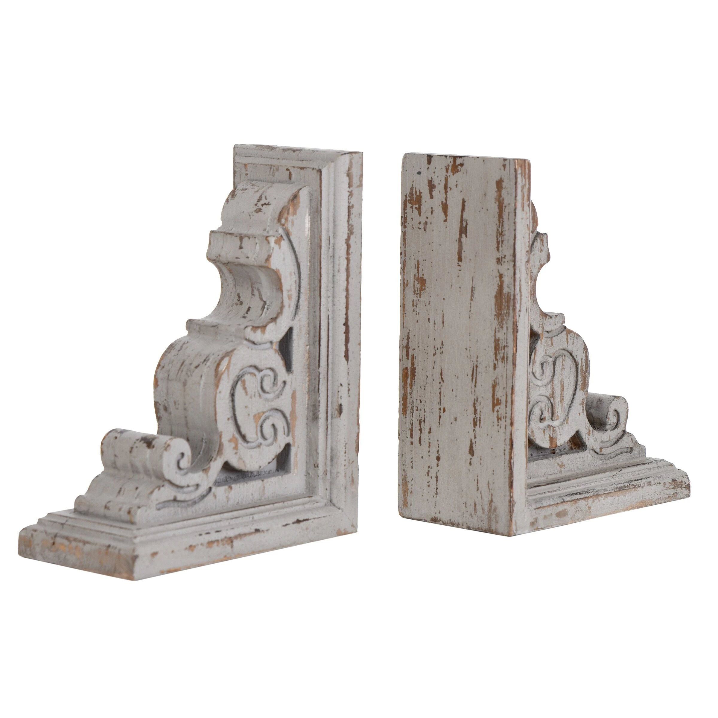 This set of 2 traditional book ends feature an elaborate scrollwork motif that will look amazing displayed on a shelf framing your favorite novels. The slightly distressed finish invites a rustic element to this design. Decorate your shelves in sophisticated, transitional style with this stylish addition.