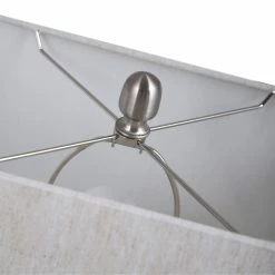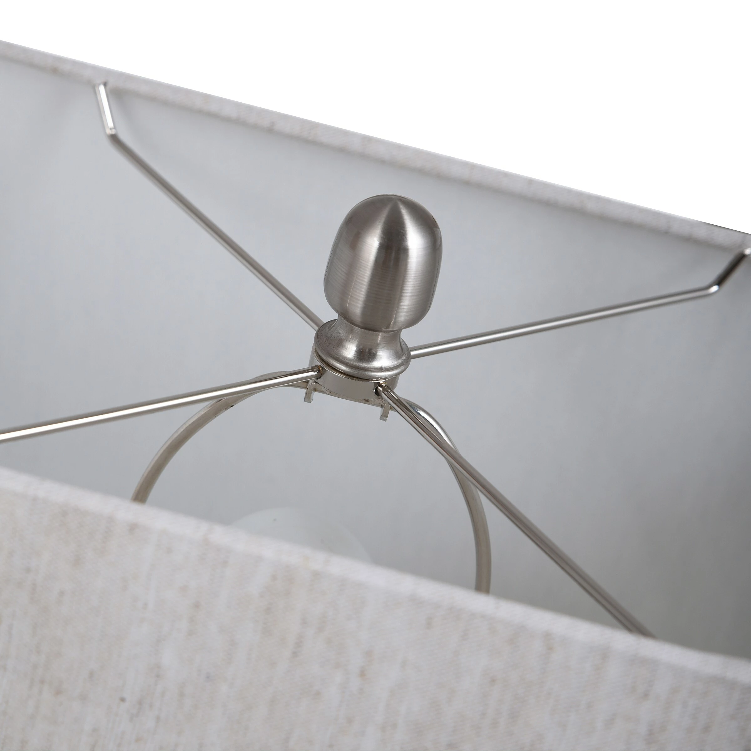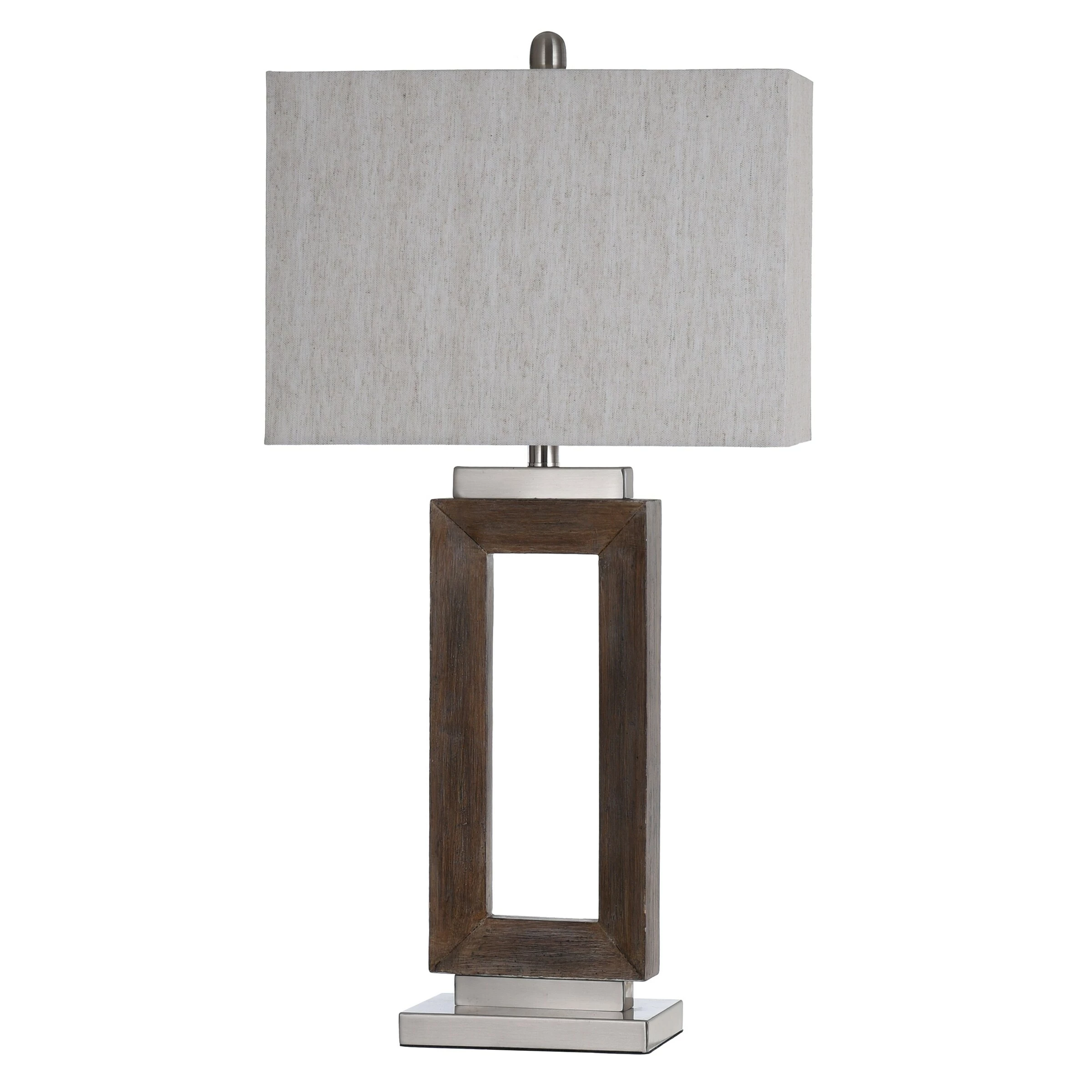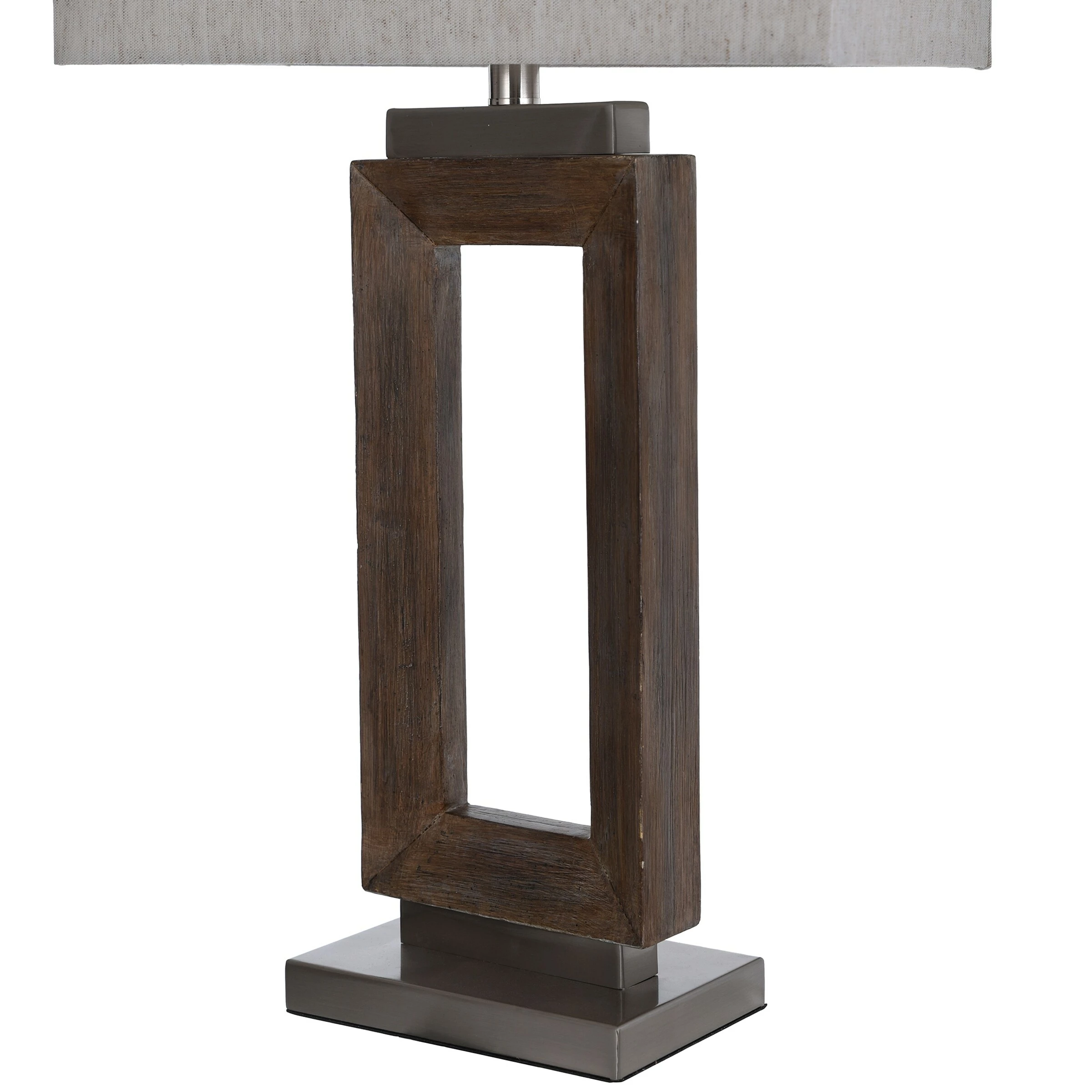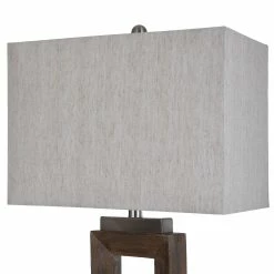 A bold contemporary fixture, the Eamon table lamp has brushed steel accents that complement the brown wooden base and the heather oatmeal linen shade. The finish on the steel accents has a light blue tint. The rectangular shade complements the frame, making this brown and silver table lamp a versatile fixture for a family room or living room.