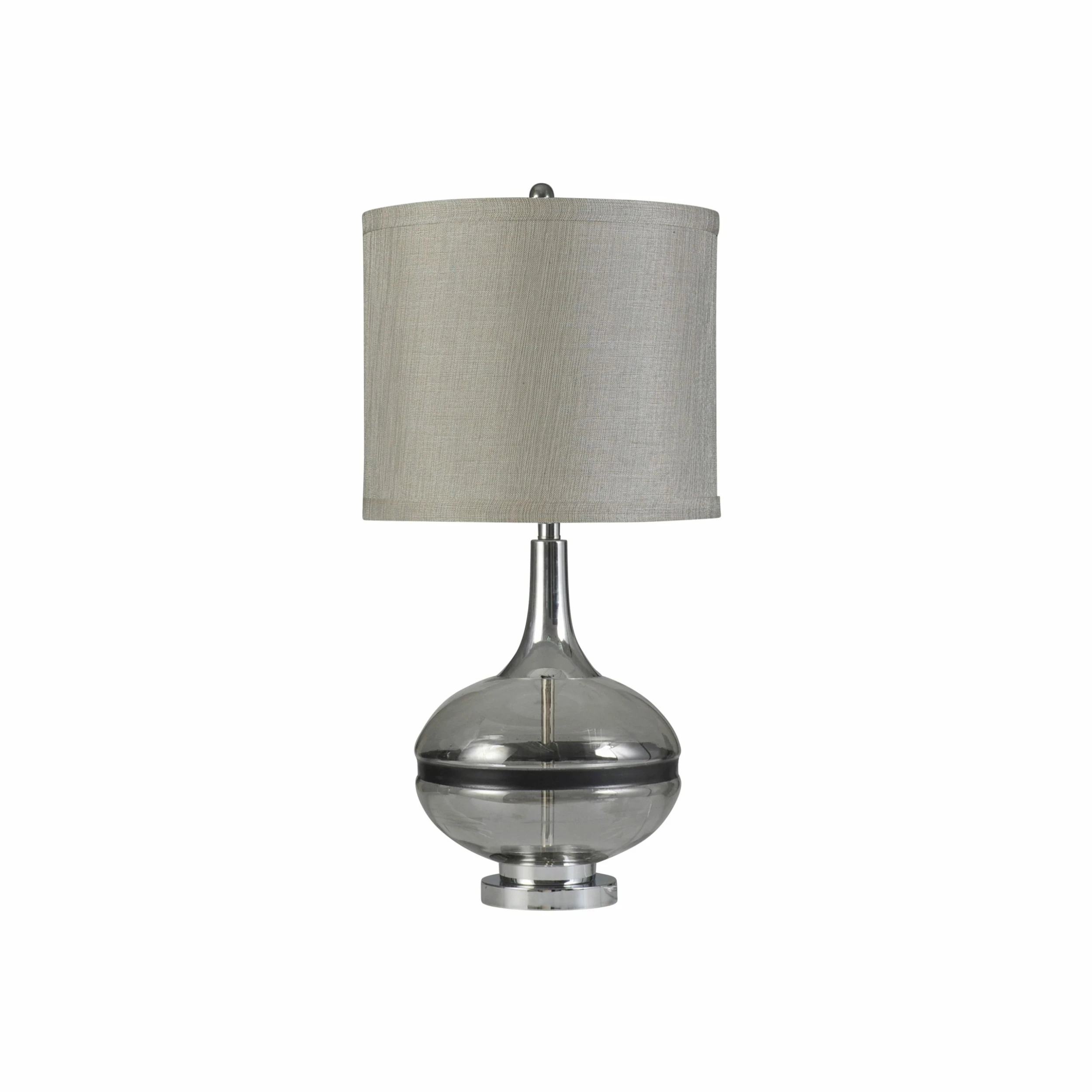 The Elyse Smoke Glass and Steel Table Lamp comes in a elyse smoke glass and steel base with taupe hardback fabric shade; Requires one (1) 150-watt Incandescent E26 base bulb (not included).