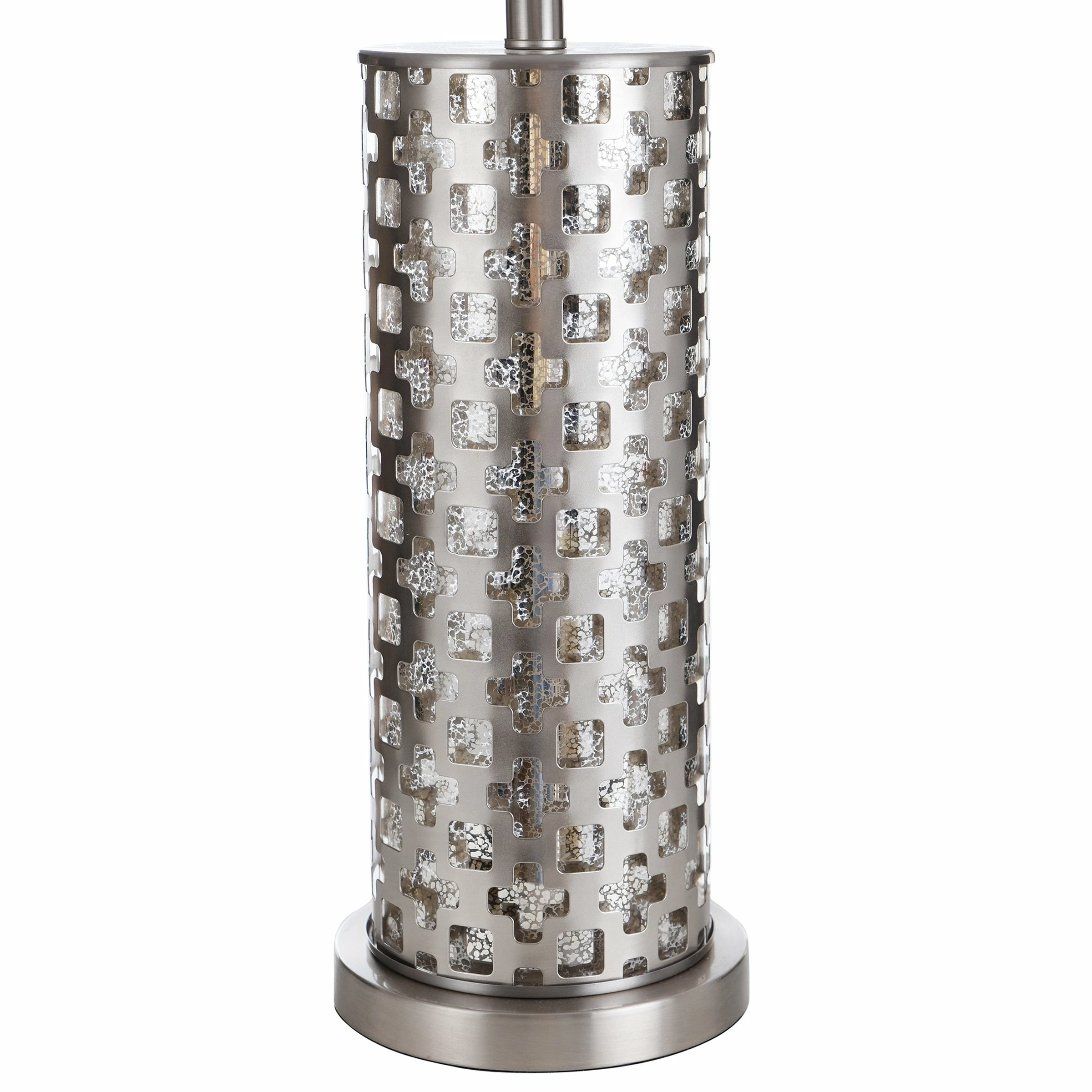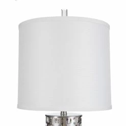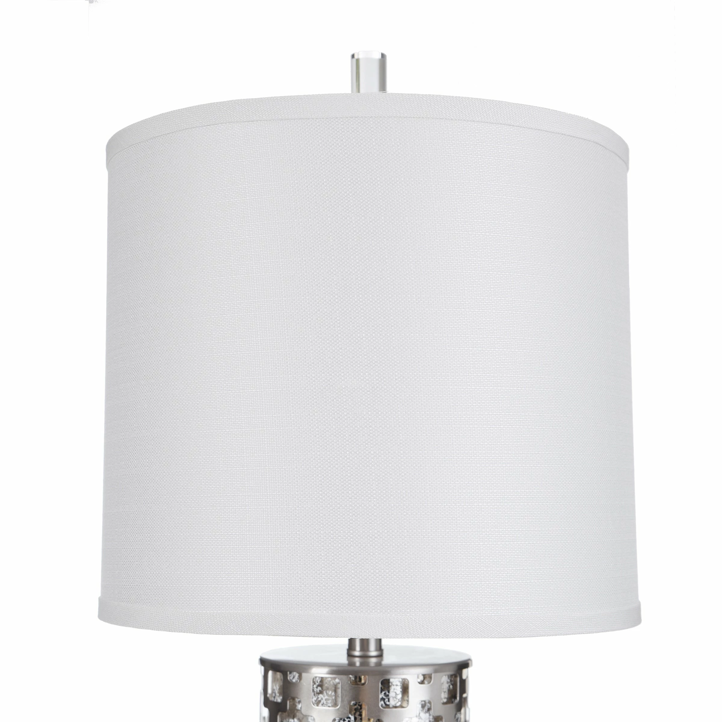 This Table Lamp comes in a brushed steel glass and poly frame with a white hardback fabric shade; Requires one (1) 100-watt Incandescent E26 base bulb (not included).
