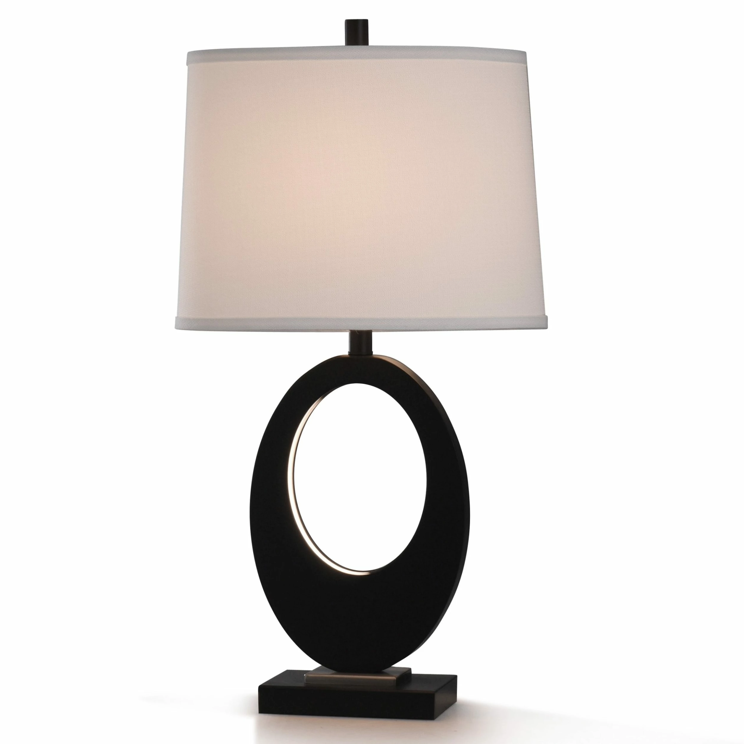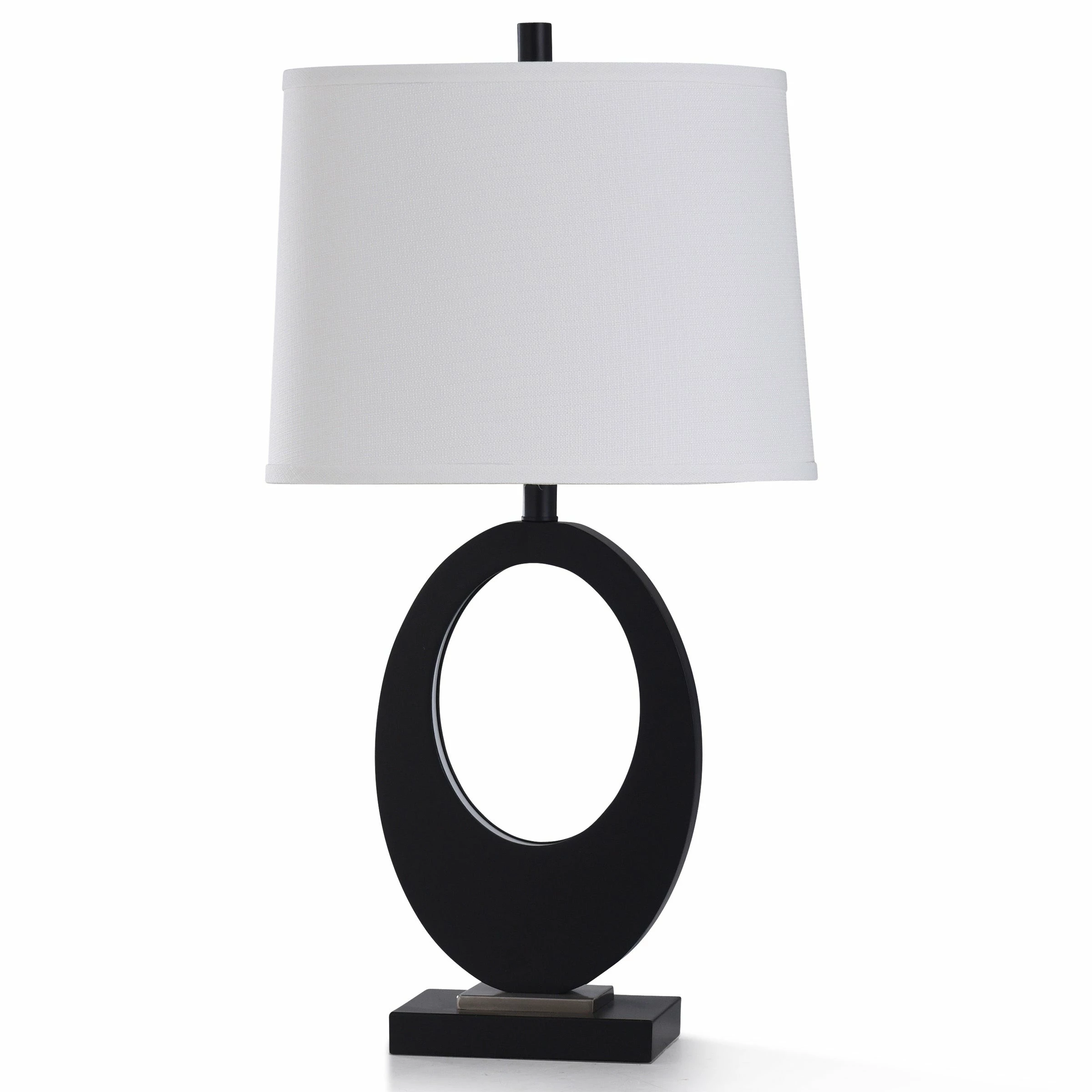 Stunning is the perfect word to describe this delightfully elegant oval-shaped Fabian table lamp. Featuring a sublimely shaped black resin stem mounted over a durable brushed steel base, this stunning contemporary three-way lighting fixture is the perfect combination of form and function. It is the ideal addition to any modern foyer, bedroom, living room or office alike.
