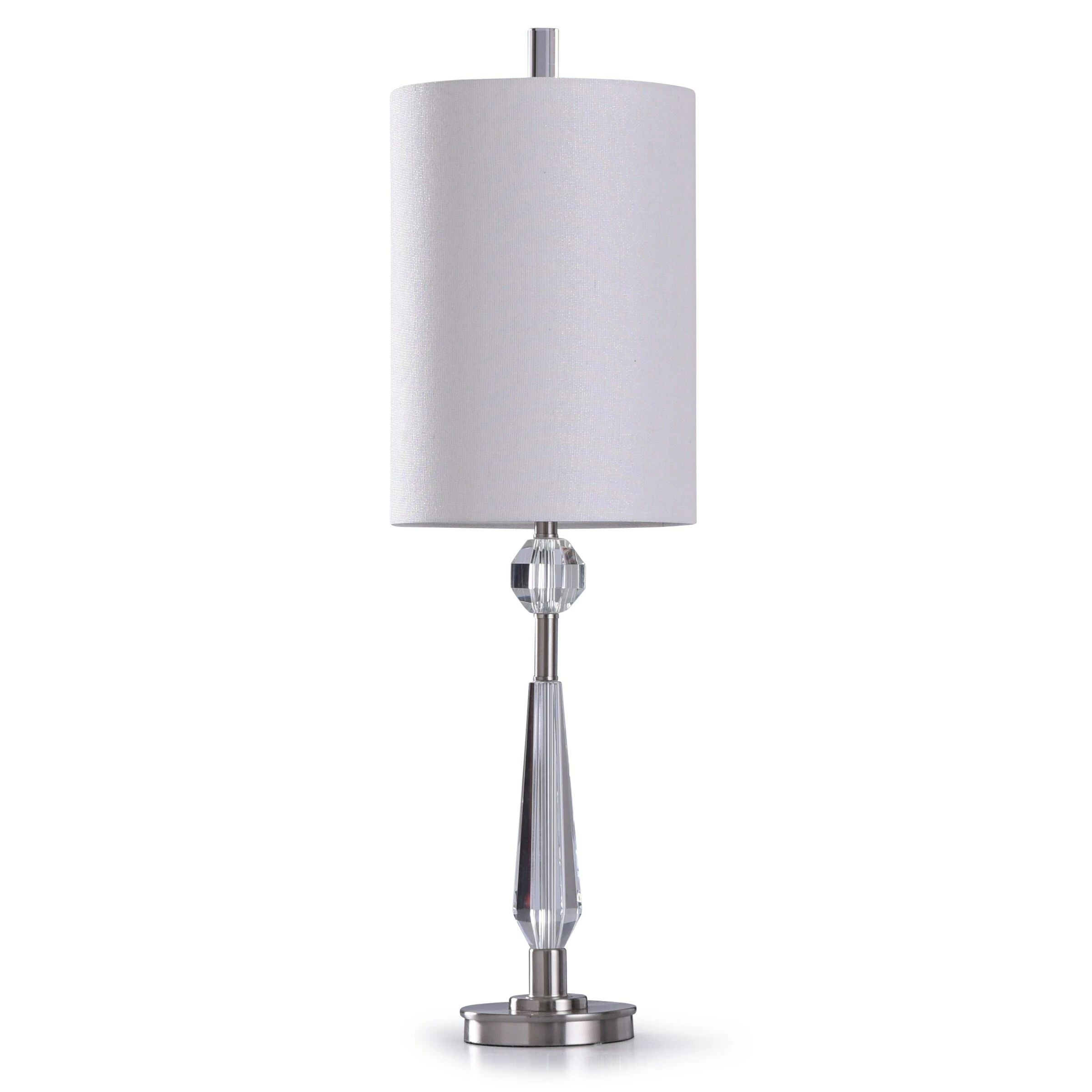 This glam style table lamp brings classic appeal to foyers, living rooms and dining rooms. The crystal and steel body forms an elegant structure below the off-white linen and polyester shade. The cylindrical diffuser provides a nice symmetrical accent to the slender shape below. Mixed materials and purposeful crafting put this lamp in a class all its own.ย