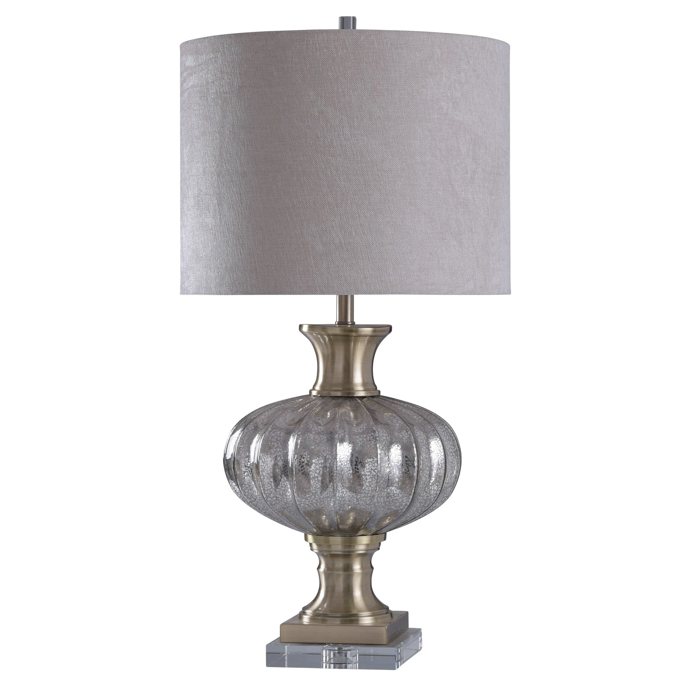 This glass and steel and crystal table lamp is a throwback look for the ages. It’s framed around an ensemble of glass and crystal elements shimmering in a gentle light. All this is topped with a round hardback shade with a rolled edge. This Table Lamp comes in a gold and silver glass, steel, and crystal frame with a white styrene shade; Requires one (1) 150-watt Incandescent E26 base bulb (not included).