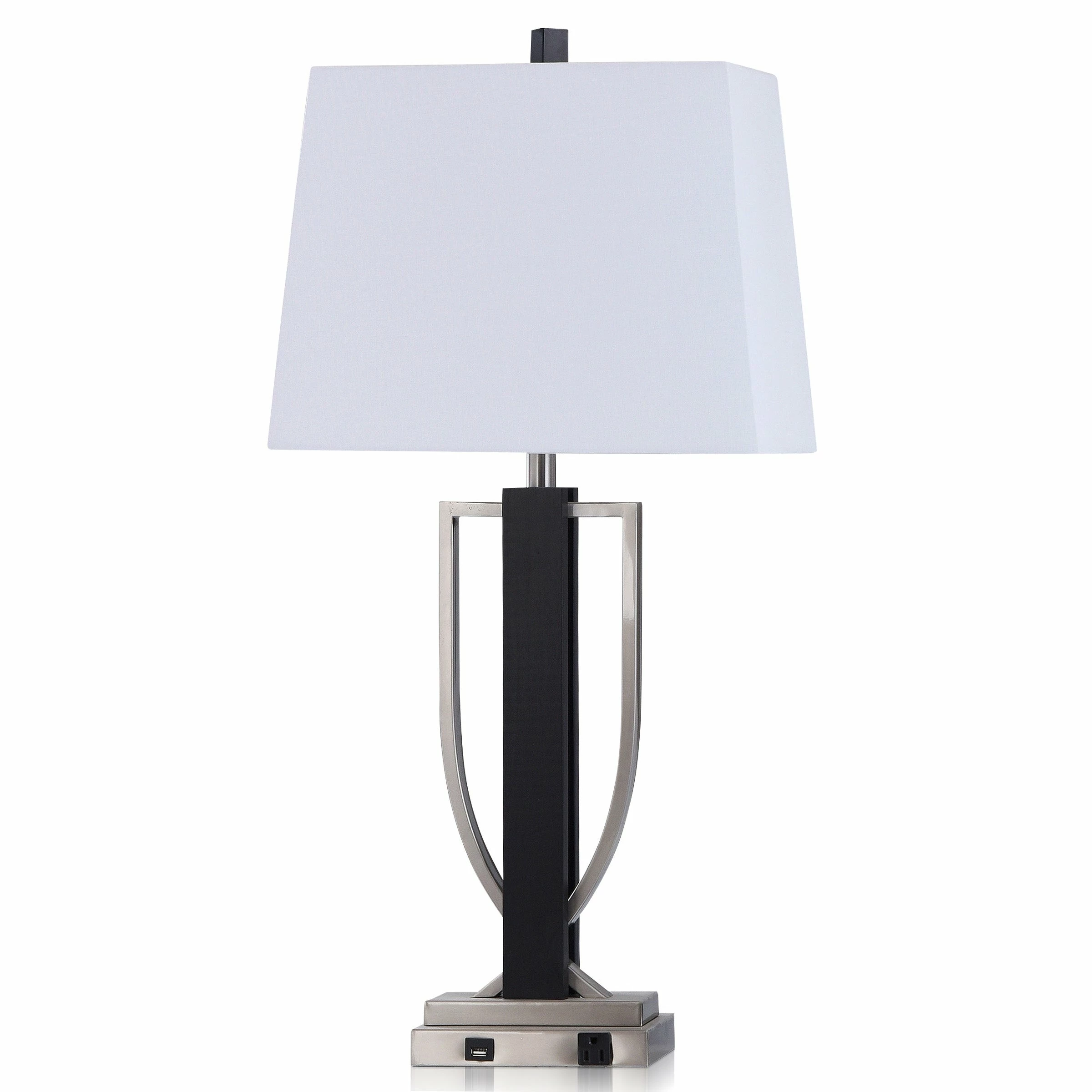 Inject some style and timeless design into your home than with this brushed steel and wood Gavin table lamp. Its distinctive brushed steel metal and black wood body features a matching finial, a white linen hardback shade, and a convenient outlet and USB slot in the front of the base. Plus, the 3-way switch helps ensure your space will always be flooded with the perfect amount of ambient light.