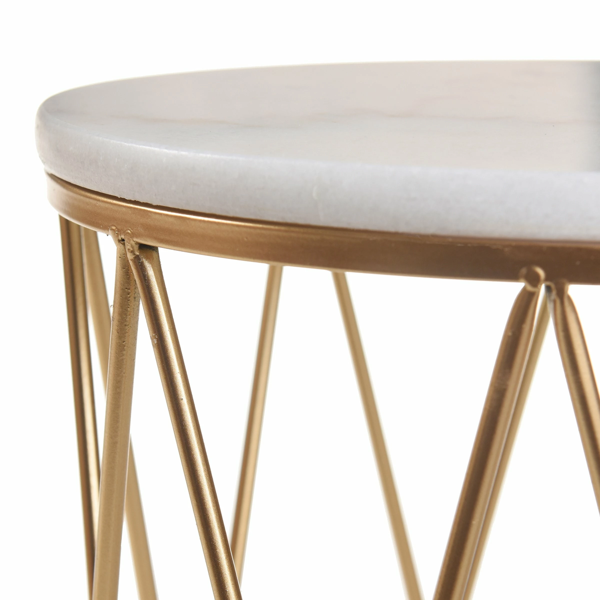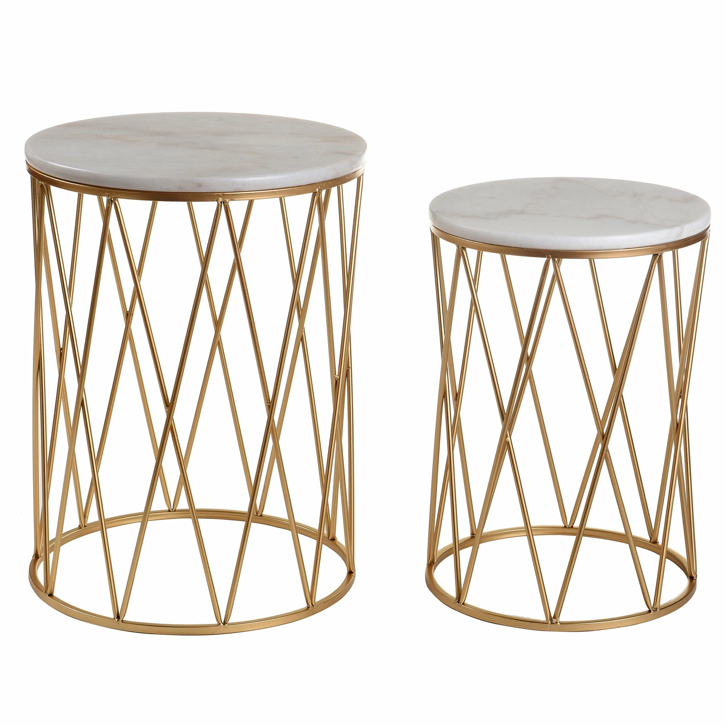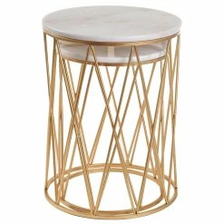 This set of two round marble top nesting accent tables features a gold metal cage base for a cool contemporary style. Made with an overlapping size and design, this duo can be displayed in a pair to create balance and presence or set in different spaces to promote continuity throughout your home. Each table is a precision crafted with a marble top to create an eye-catching centerpiece in its own right.