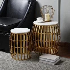 Featuring classic style, this gold cage nesting table set will enhance your living room dΓ©cor. Each table is complete with a marble top. Place the larger table over the small one to save on space.