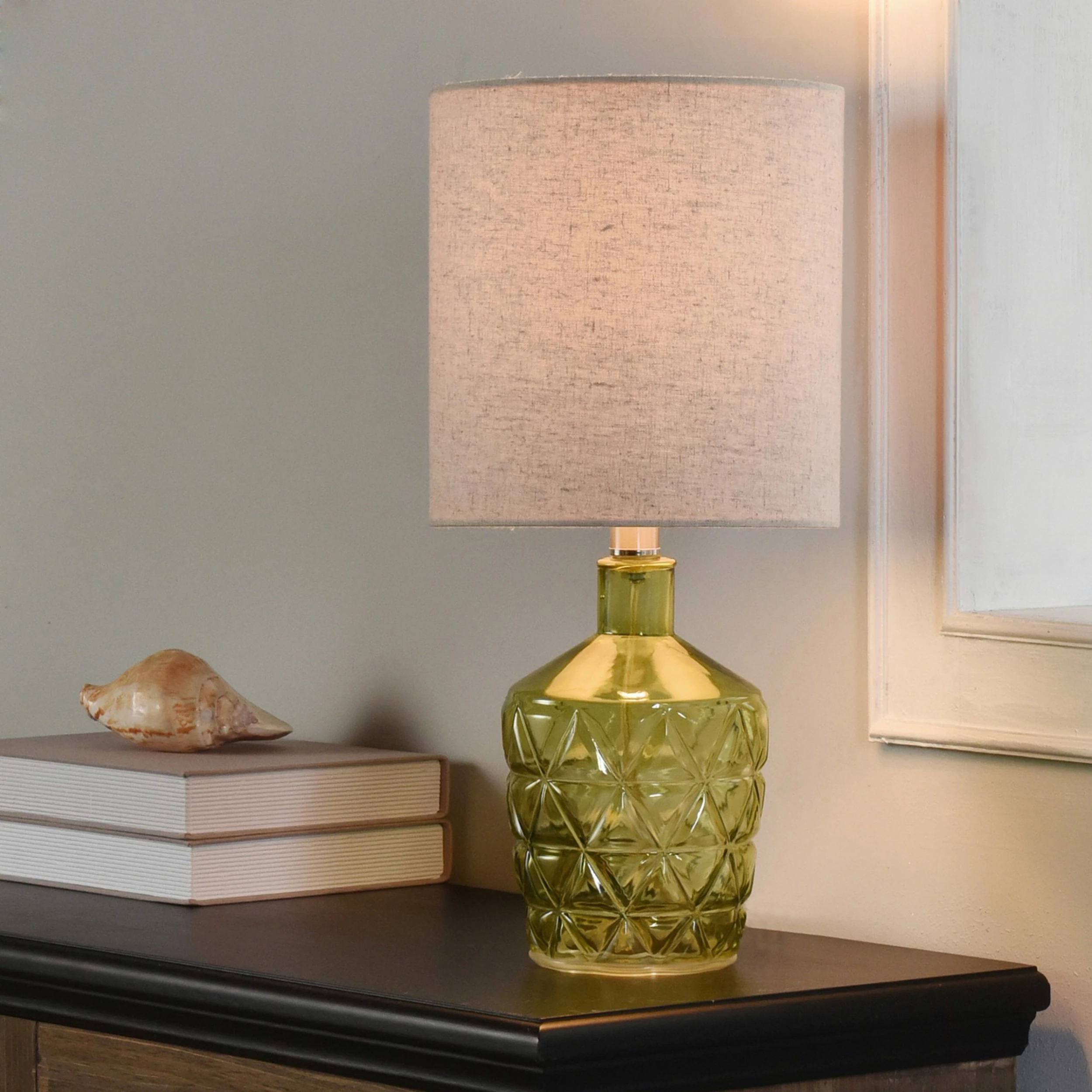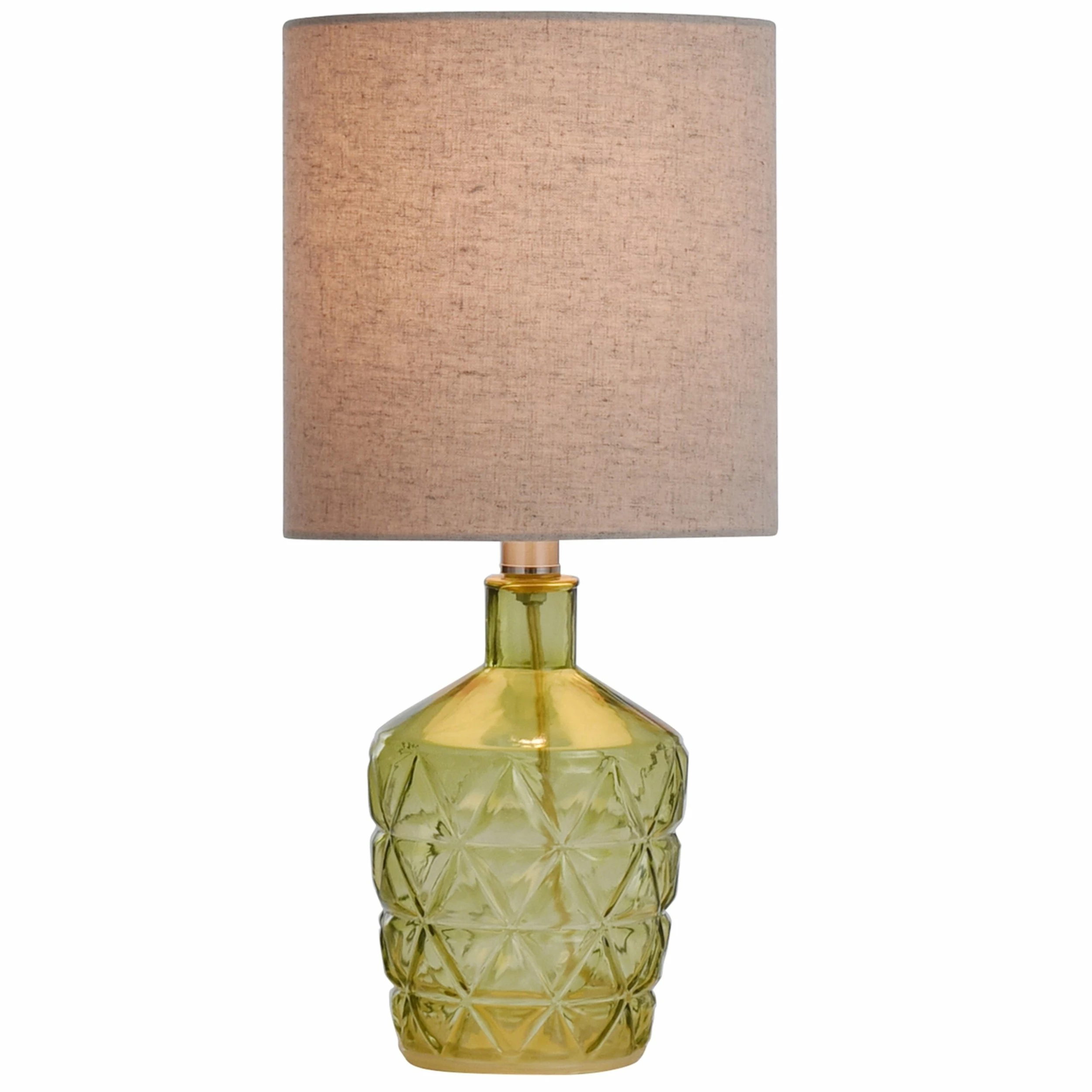 This table lamp comes in a grass green finish with heathered light beige shade; Requires one (1) 40-watt Incandescent base bulb (not included).