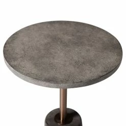 This round accent side table is made with a heavy round concrete pedestal base for a powerful contemporary style. Made with minimal lines and a wide round cement top, this side table uses less to get so much more out of a room. Its combination of heavy, industrial tones, notably grey and bronze finish metal, are at home in a variety of color motifs and design inspirations.