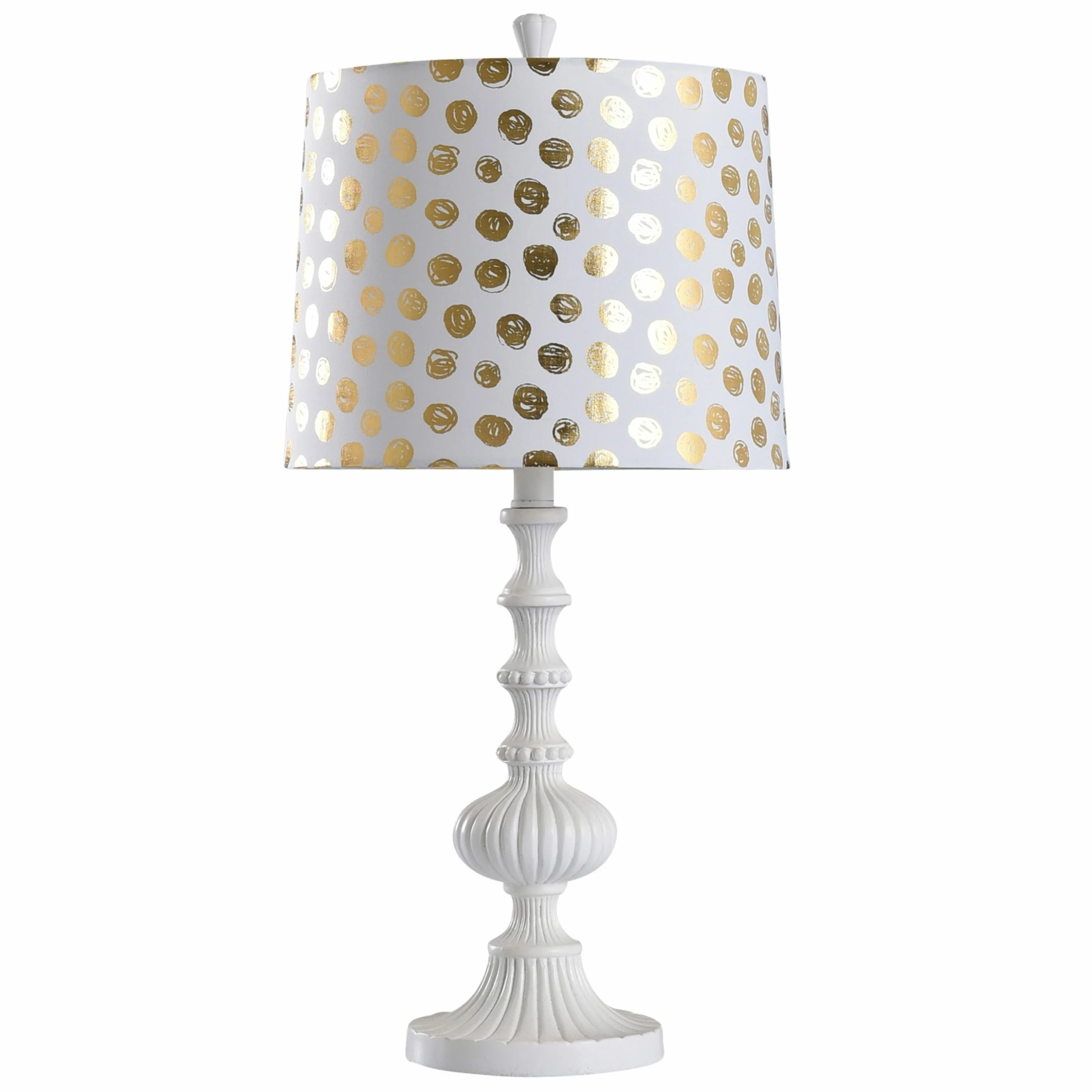 The Halifax table lamp boasts a striking, white and gold printed designer shade with polka dots. The body has a white finish and is adorned with notches. This statement-making lamp is ready to spruce up your nightstands.
