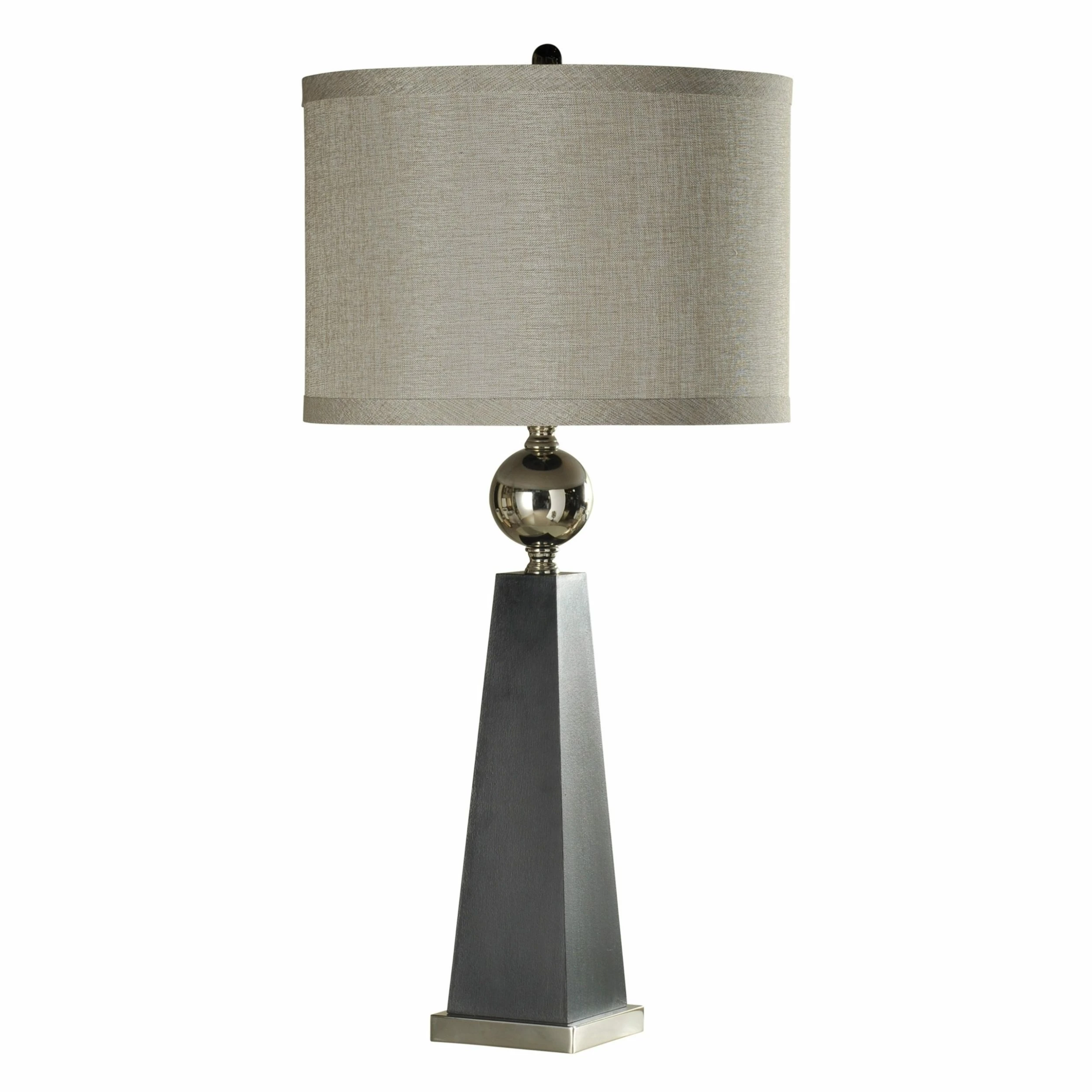 The Hargis accent table lamp uses a strong profile body in gray finish with chrome touches to stand out on any tabletop. It’s made with a bold sense of line and shape, from its pyramid base to its round ball accent. This lamp is topped with a taupe hardback shade with wide band accents for a complete look.