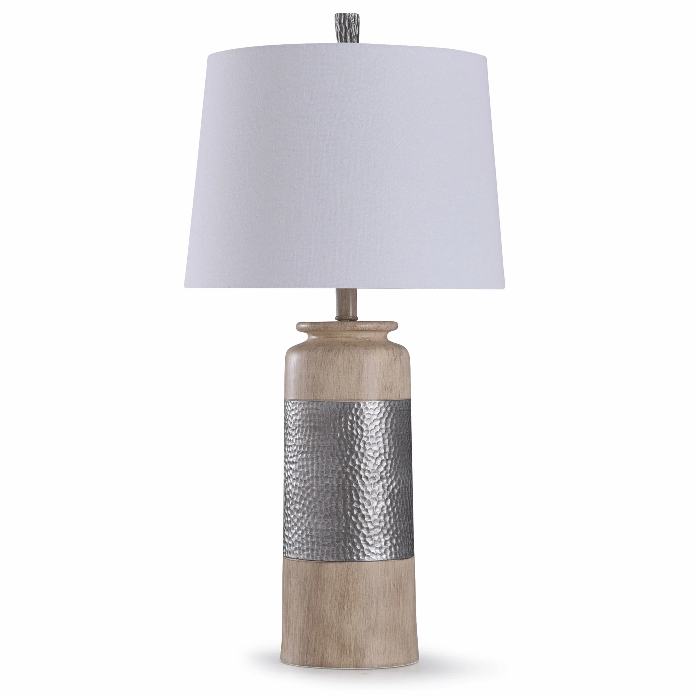 A rustic piece that discovers impressive style through its mix of materials. The polyresin body has a traditional shape and a tan finish, with a painted hammered silver band adding a nice textured accent. The off-white shade is made of linen and polyester, a smooth complement to the lamp’s farmhouse aesthetic. A traditional table lamp that’s ideally suited for living rooms, dining rooms, bedrooms and foyers.