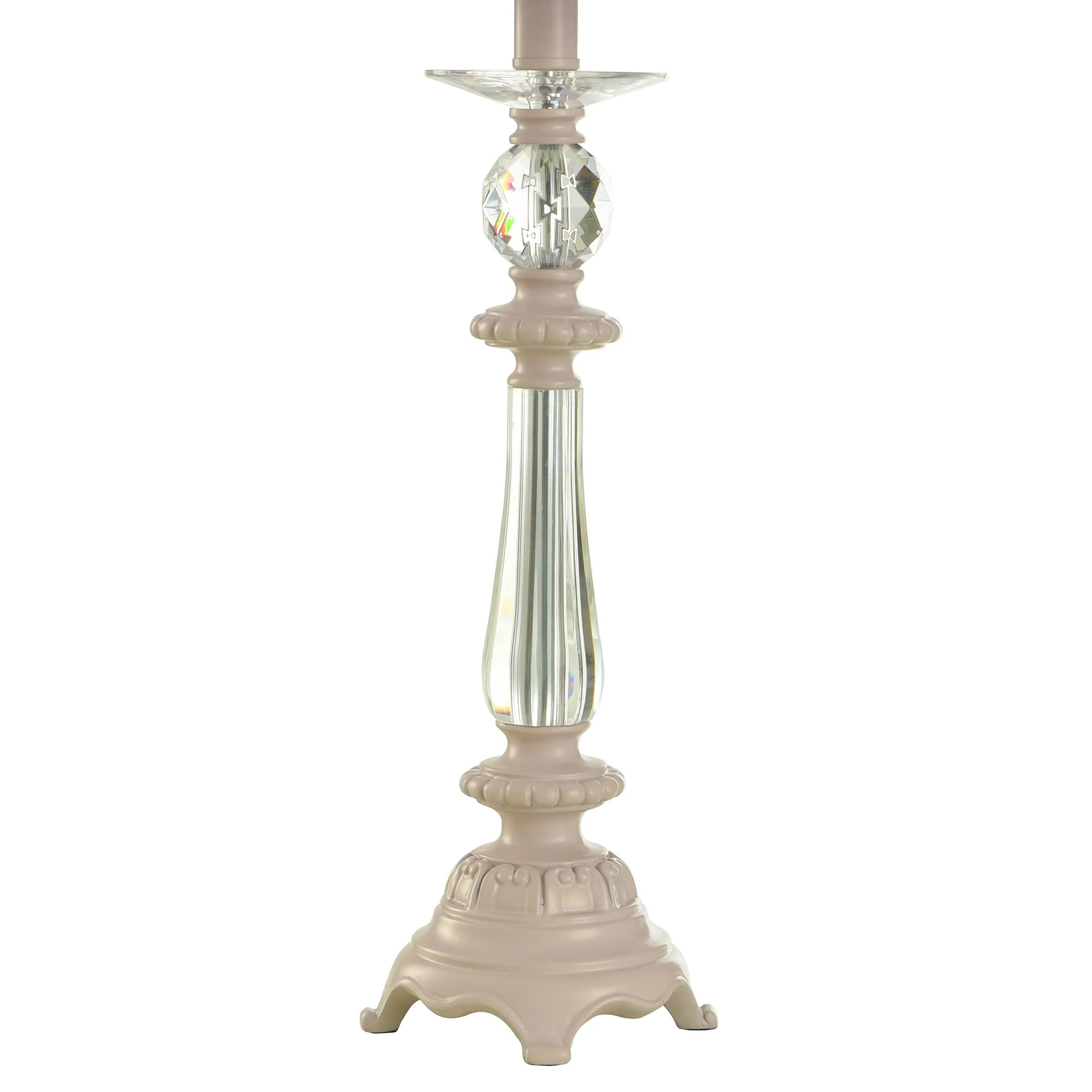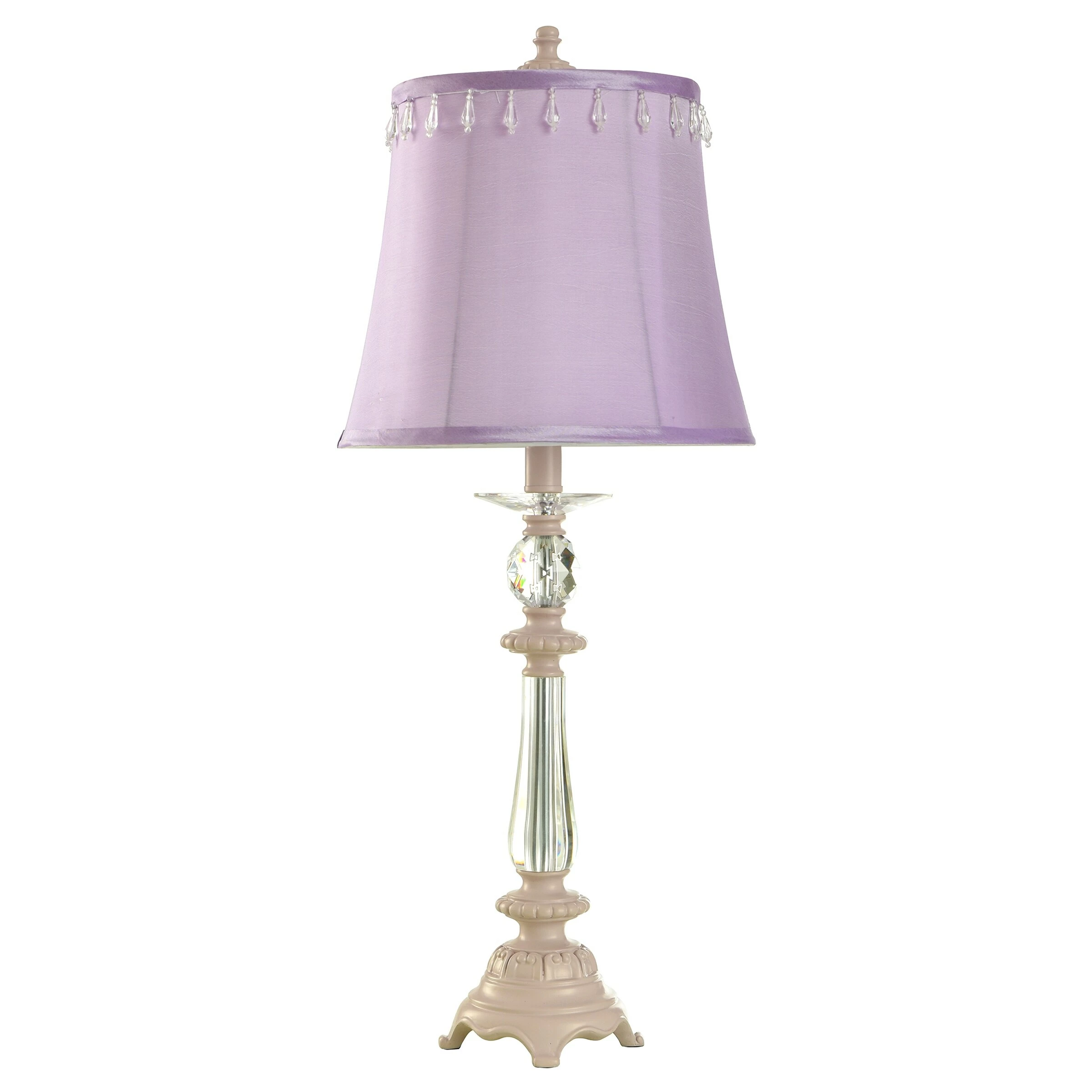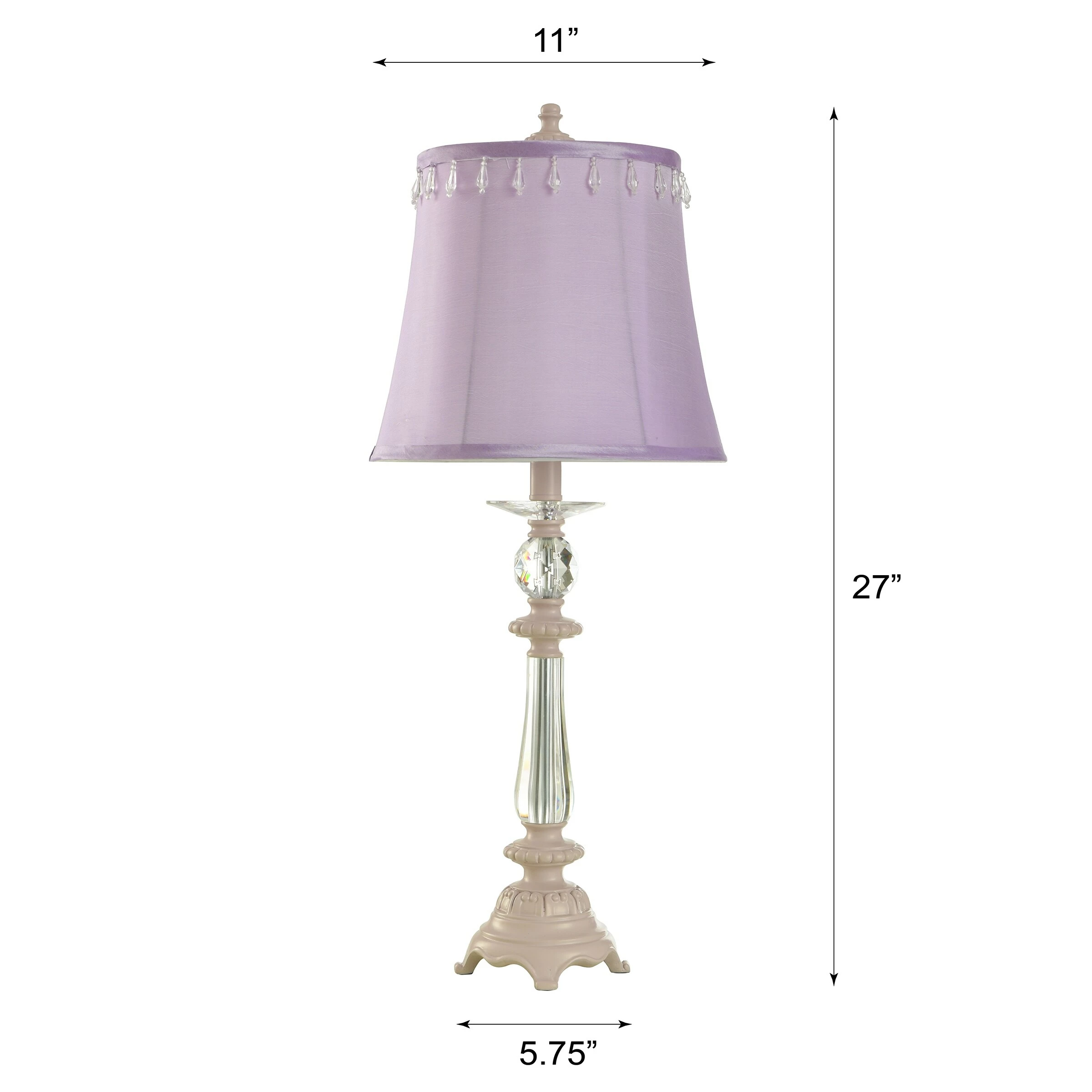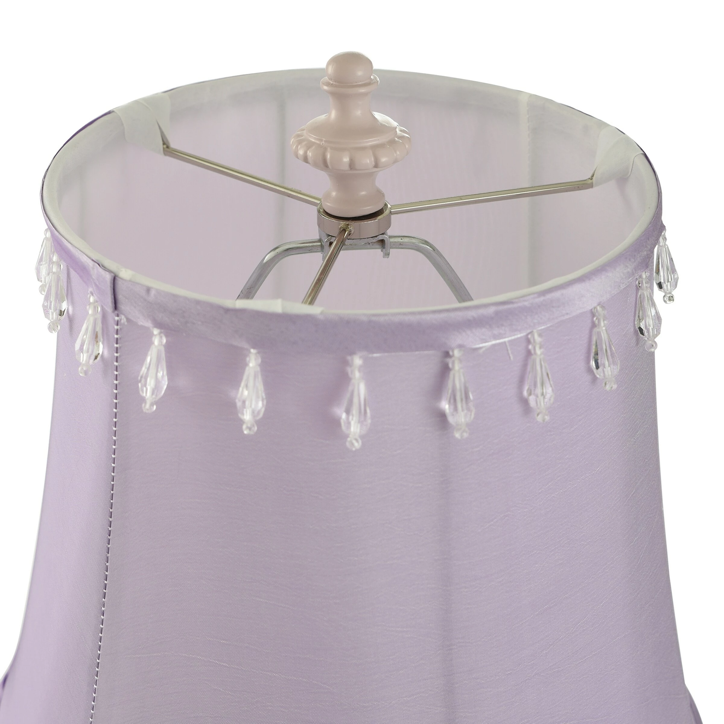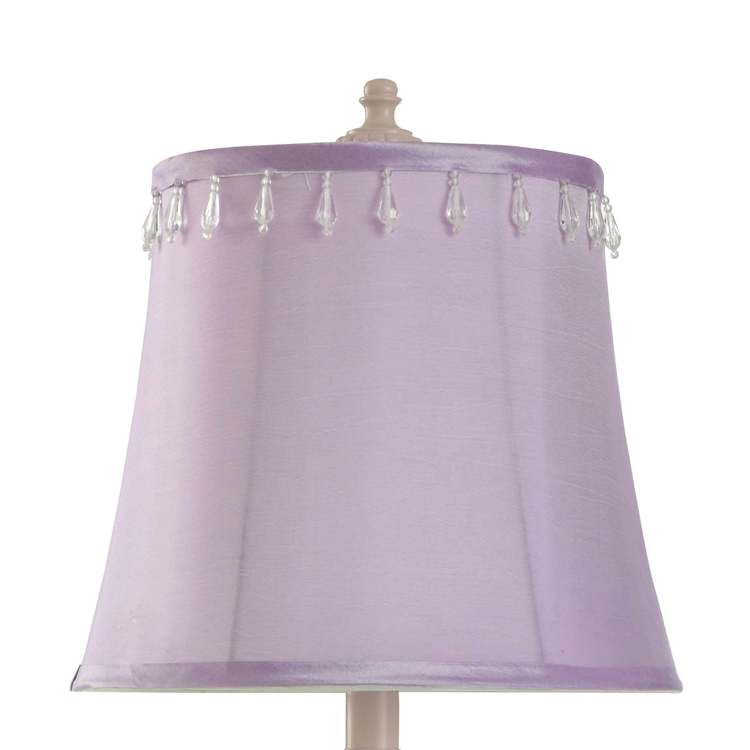 This Table Lamp comes in a crystal and purple poly frame with a purple softback fabric shade; Requires one (1) 60-watt Incandescent E26 base bulb (not included).