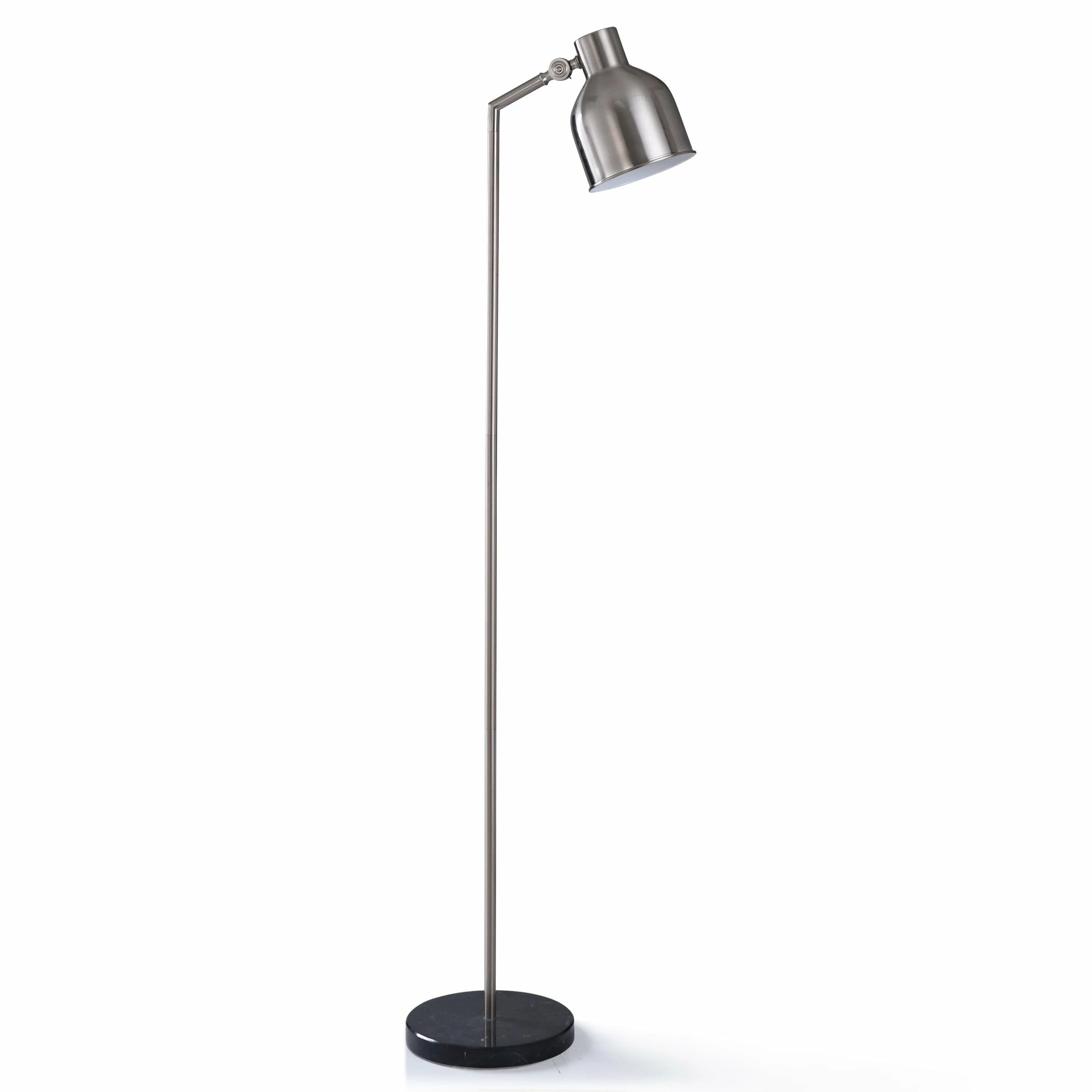 Simple and elegant, this Irby silver floor lamp features a brushed steel stem anchored to an eye-catching natural black marble base. The clean lines of this minimal piece are made functional with its adjustable head. This will complement any design element and be best utilized in an office space or bedroom.