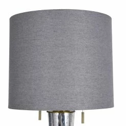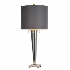 The Jasper Pillar Table Lamp anchors the tabletop décor in an office, bedroom, or living room with its gleaming mercury glass frame, light grey shade, and base of mixed materials. Two matching pull chains hang down beneath the drum shade, which enhances the mercury glass frame with light grey fabric shade. Providing another accent to the beautiful frame is the lamp’s base, which features natural marble and chrome metal.