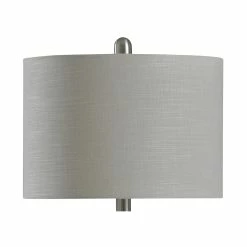 This table lamp comes in a distressed gray and white frame with a light gray and beige shade; Requires one (1) 60-watt Incandescent E26 base bulb (not included).