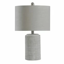 This table lamp comes in a distressed gray and white frame with a light gray and beige shade; Requires one (1) 60-watt Incandescent E26 base bulb (not included).