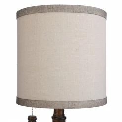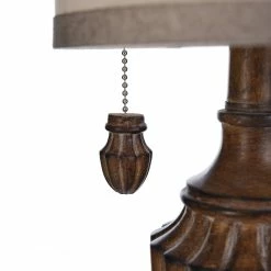 The traditional Kerala Mini Table Lamp works with any style home. Turn the light on or off by using the pull chain extending downward. The white hardback fabric shade contrasts fantastically with the brown body. Add this piece to your living room for a unique flair.