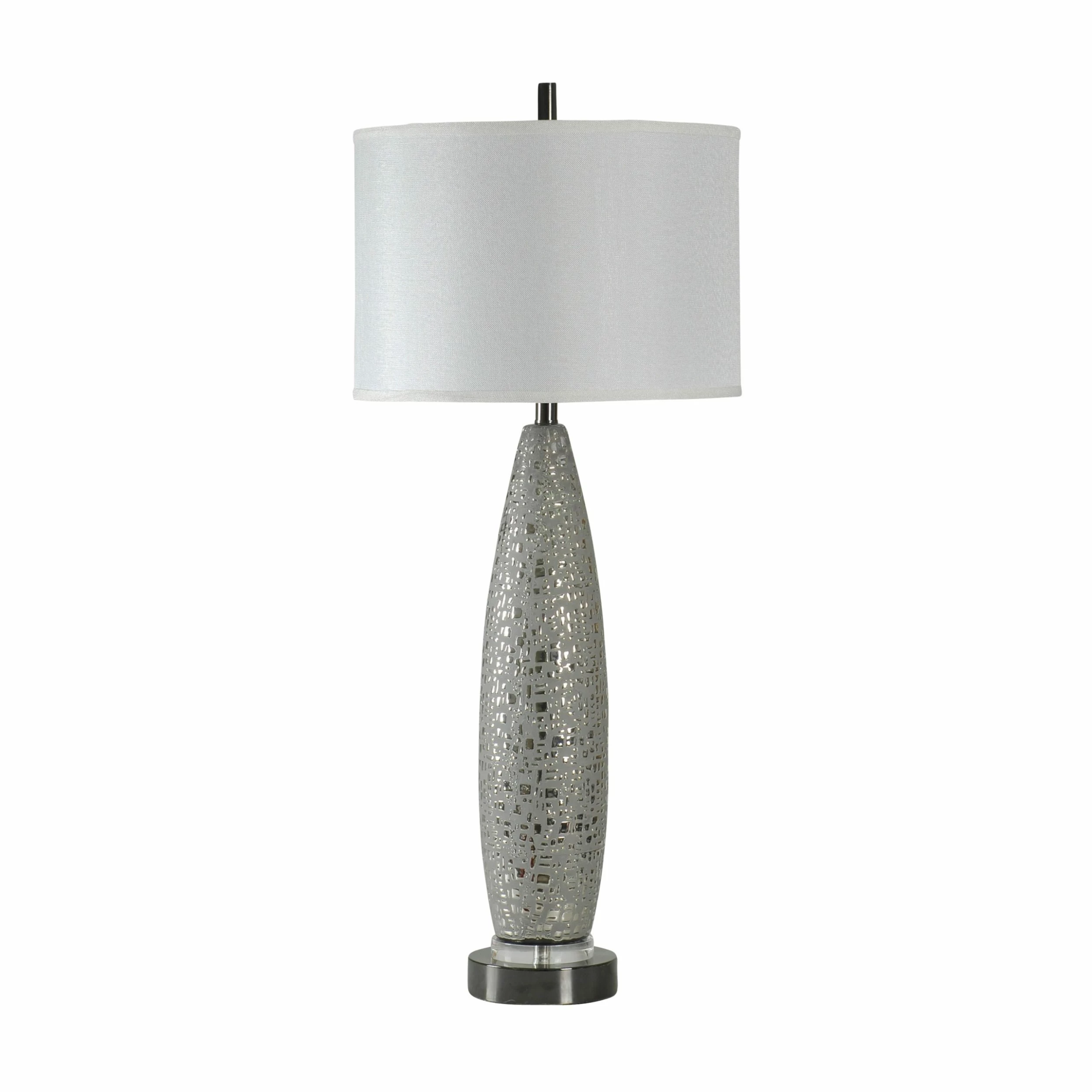 The sleek and contemporary Kettering ceramic table lamp features shimmering mirrored accents on its silver body. Made with a gently tapered profile, this lamp is mounted on a round base with a minimalist metal finial. To bring its modern feel together, it comes topped with a white round hardback shade.