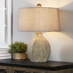 With excellent curvature and neutral coloring, the Laurie table lamp is a perfect piece to add to a modern living room. Poly materials were used in the construction of this lamp, and it is adorned with a bokava finish. White styrene fabric was used to make the shade. You get both superb illumination and a fine piece of art with this lamp. A handpainted finish means each piece is unique, with possible slight variations. No two lamps are exactly alike.