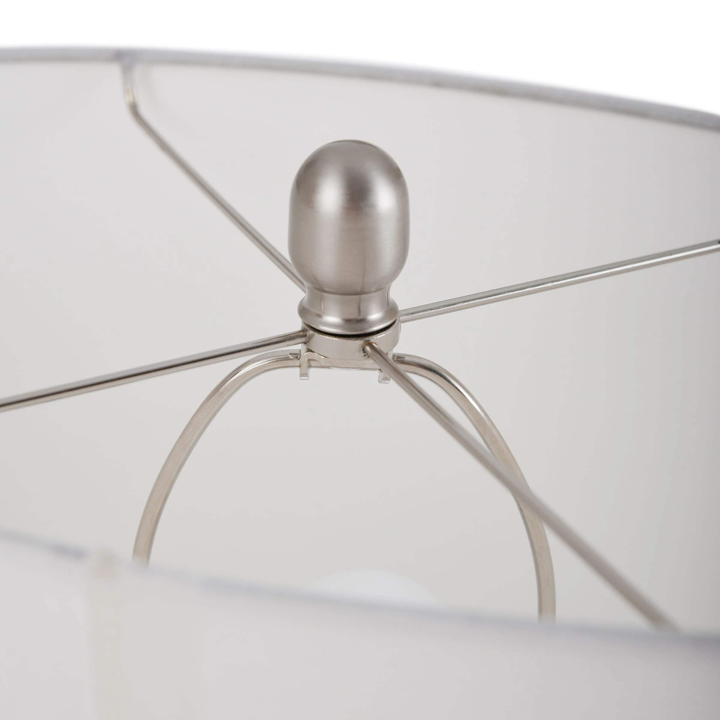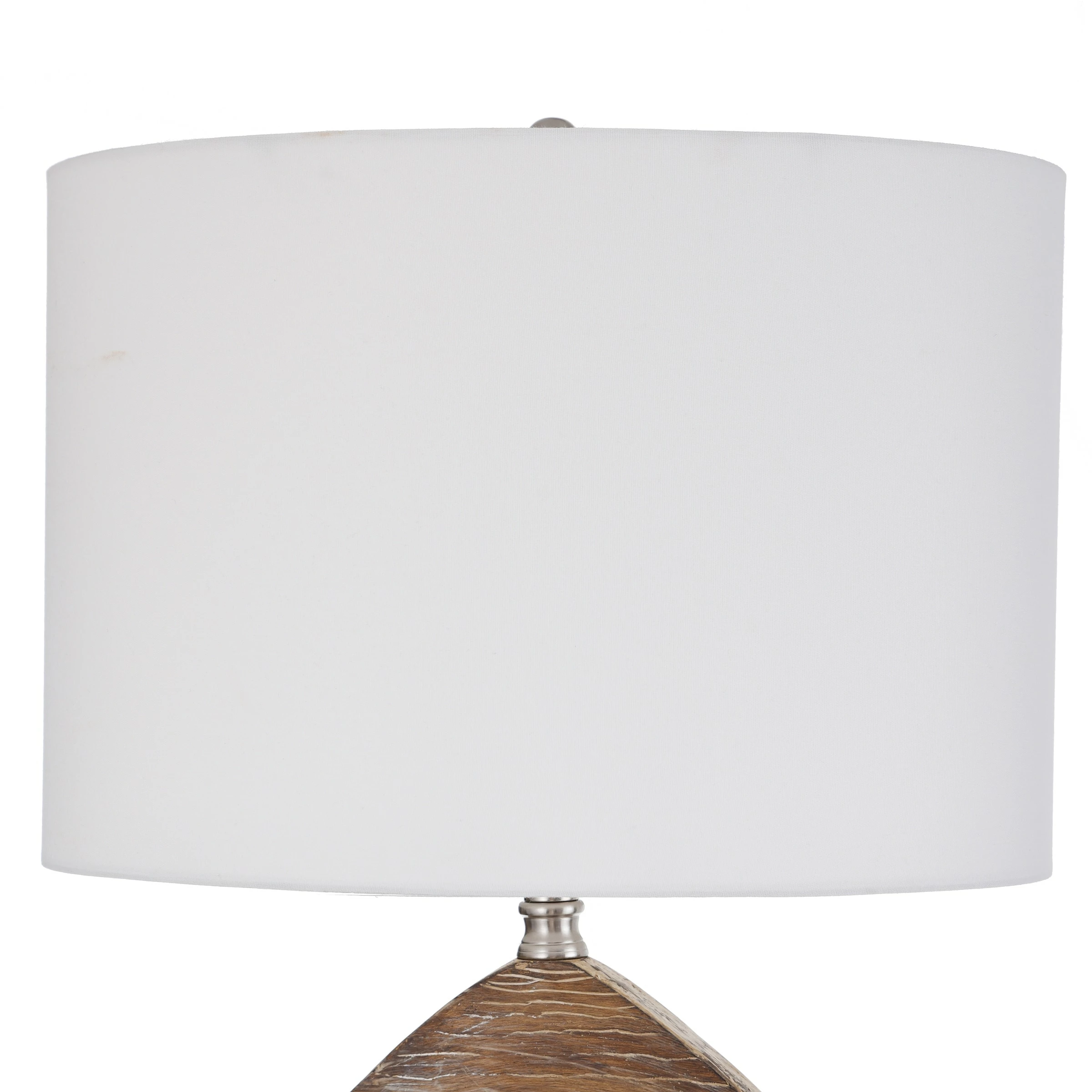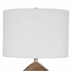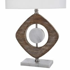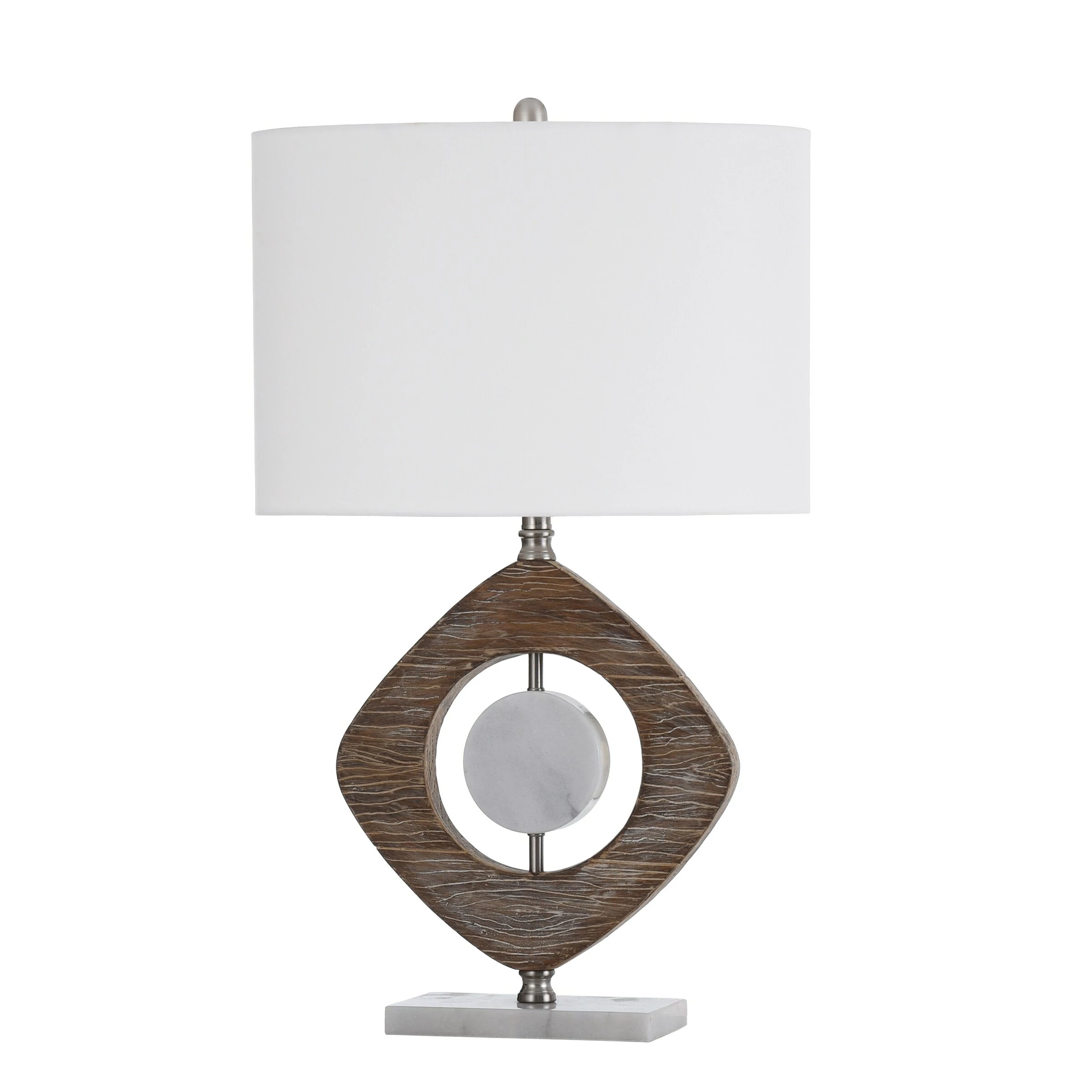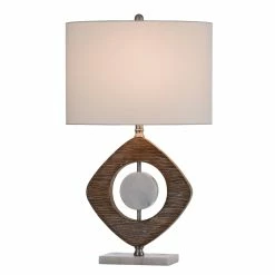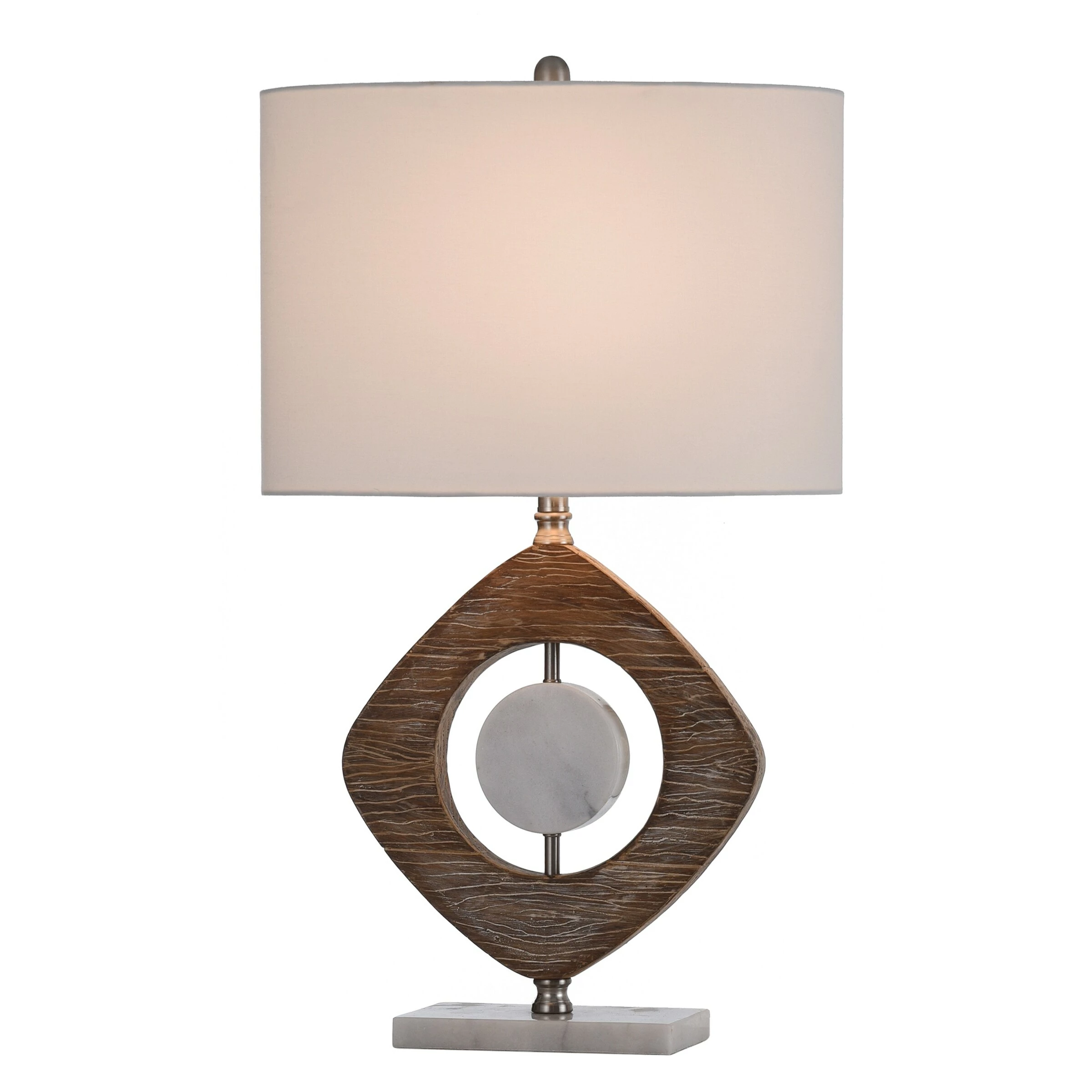 Sure to capture attention in any space, the contemporary Lucy table lamp has a white oval shade over a frame featuring white marble and molded polyresin with a wood-like finish. The white marble base matches the marble disc at the center of the frame. An attractive accent for a living room or family room, this marble table lamp is topped off with a brushed chrome finial.