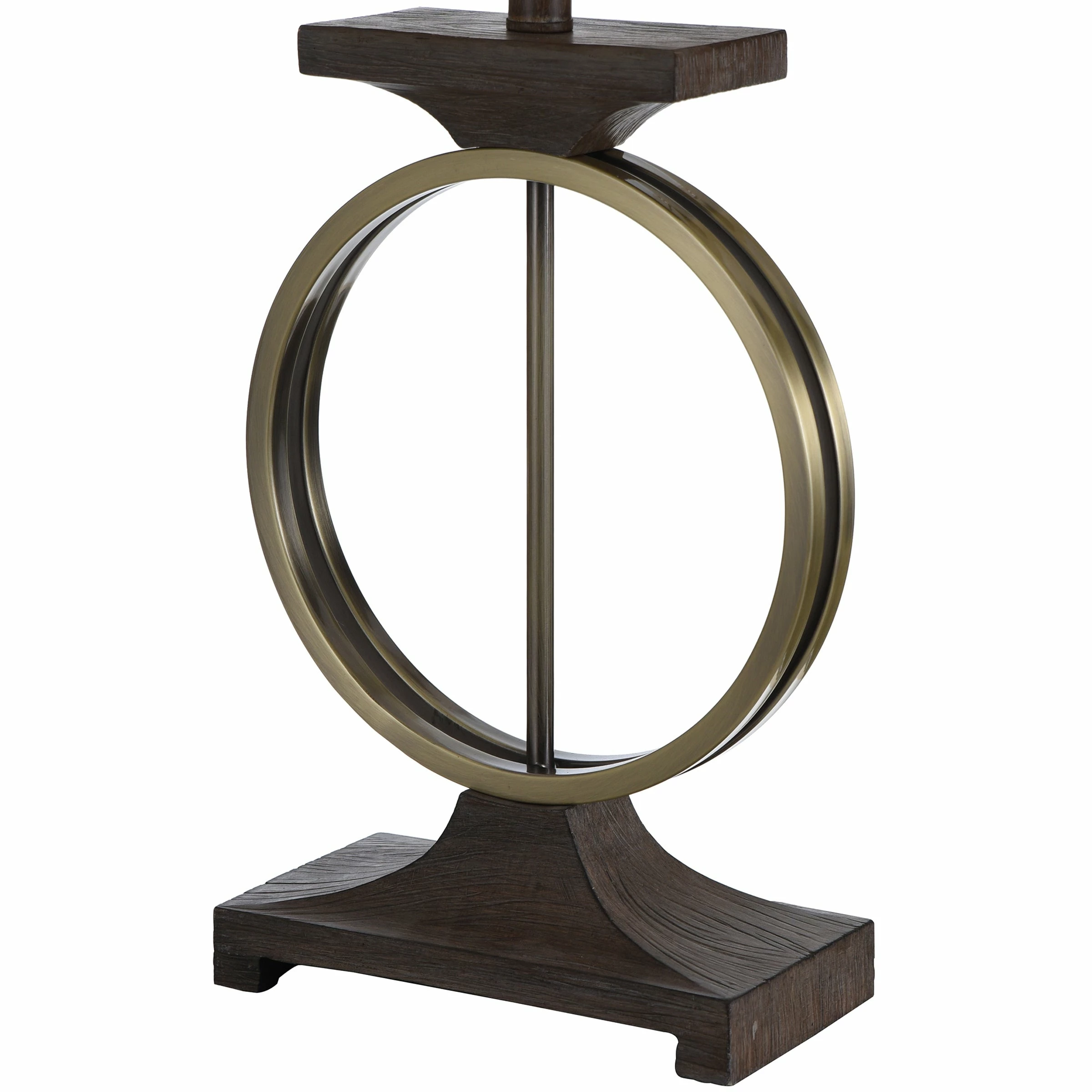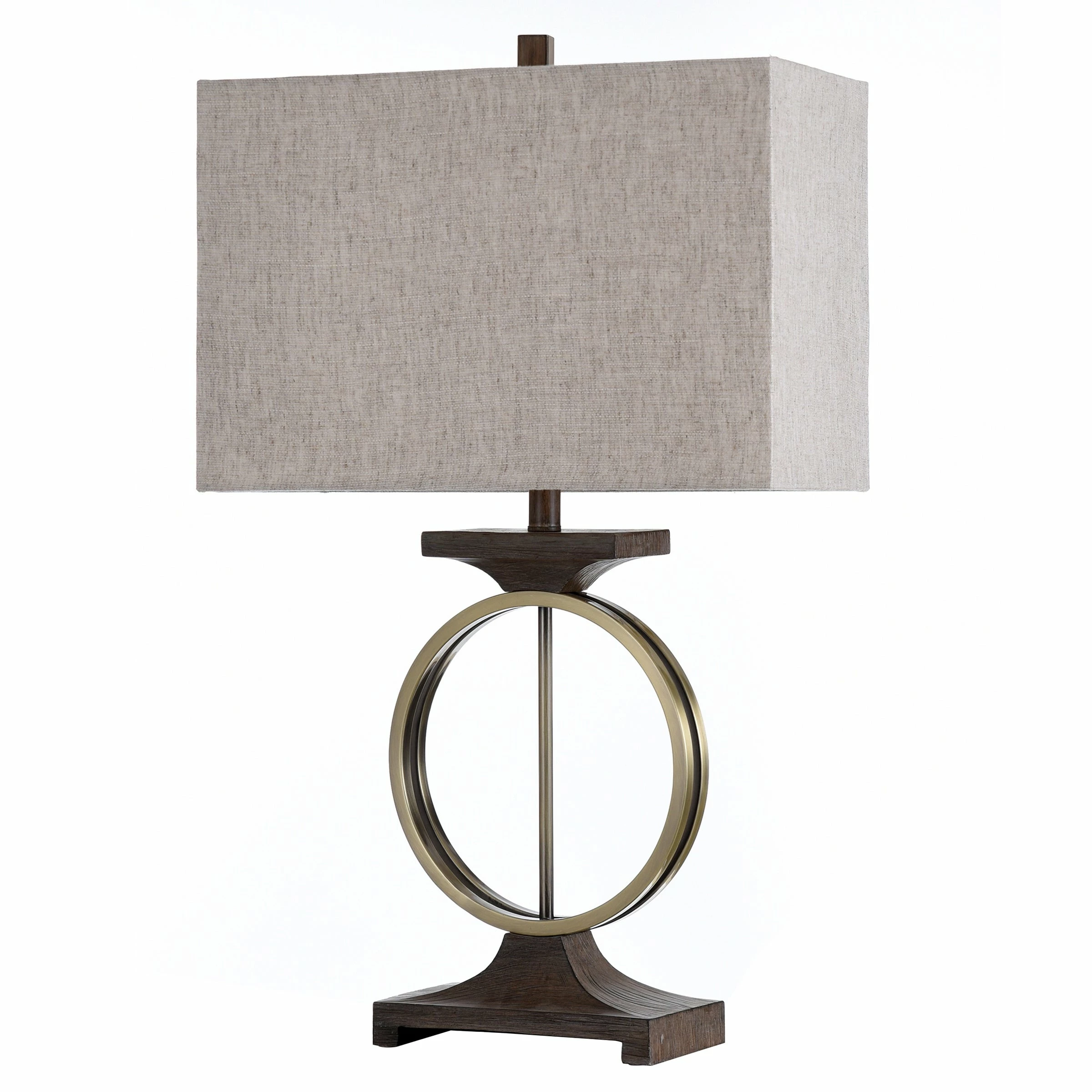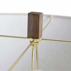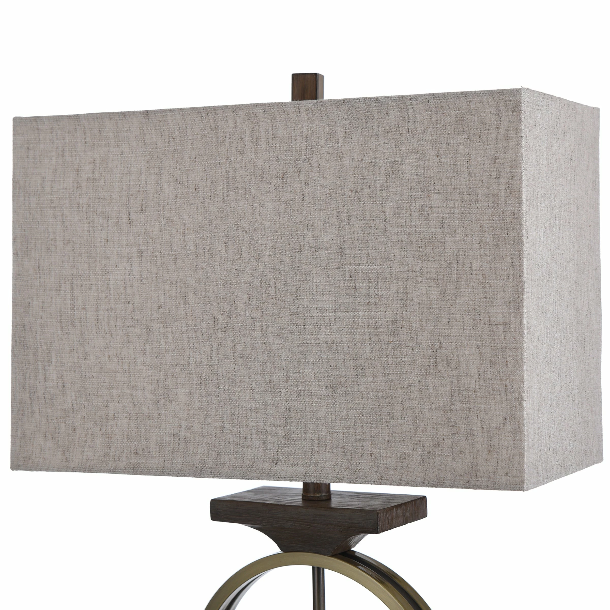 The contemporary Maconfield table lamp features a heather oatmeal linen shade over a brass ring-shaped frame with a light mint finish and dark wood-like accents. The intriguing shape of the base and the lamp’s unique production process ensure it is a one-of-a-kind accent piece. A three-way switch makes this brass and wood table lamp a stylish and functional addition to a family room or living room.