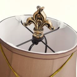 A sophisticated finishing touch with versatility, the Maximus mini accent table lamp uses its small size to bring big personality to a space. it features a classic curved body in a dark bronze tone with numerous fleur-de-lis accents, including a hanging pendant accent on its beige fabric hardback shade. It’s a throwback look that enhances the heirloom aesthetic of your modern home.