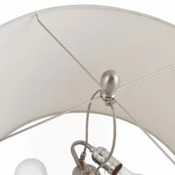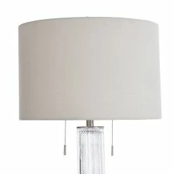 A beautiful addition to contemporary decor, the McBride table lamp has a brushed steel base, a textured clear glass column body, and an off white shade. Brushed steel accents include rings on the glass frame, two pull switches, and the finial. Add this silver and white glass lamp to an end table in a living room or family room.
